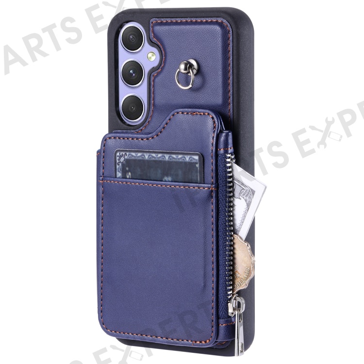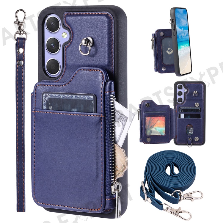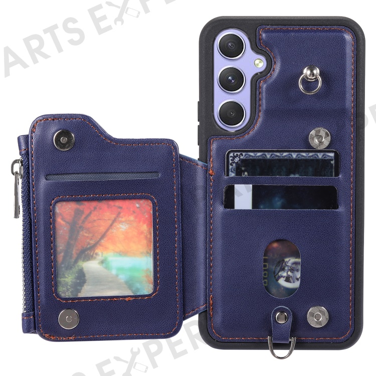 009 For Samsung Galaxy A54 5G RFID Blocking Zipper Wallet Protective Case PU Leather+TPU Kickstand Phone Cover with Straps - Blue