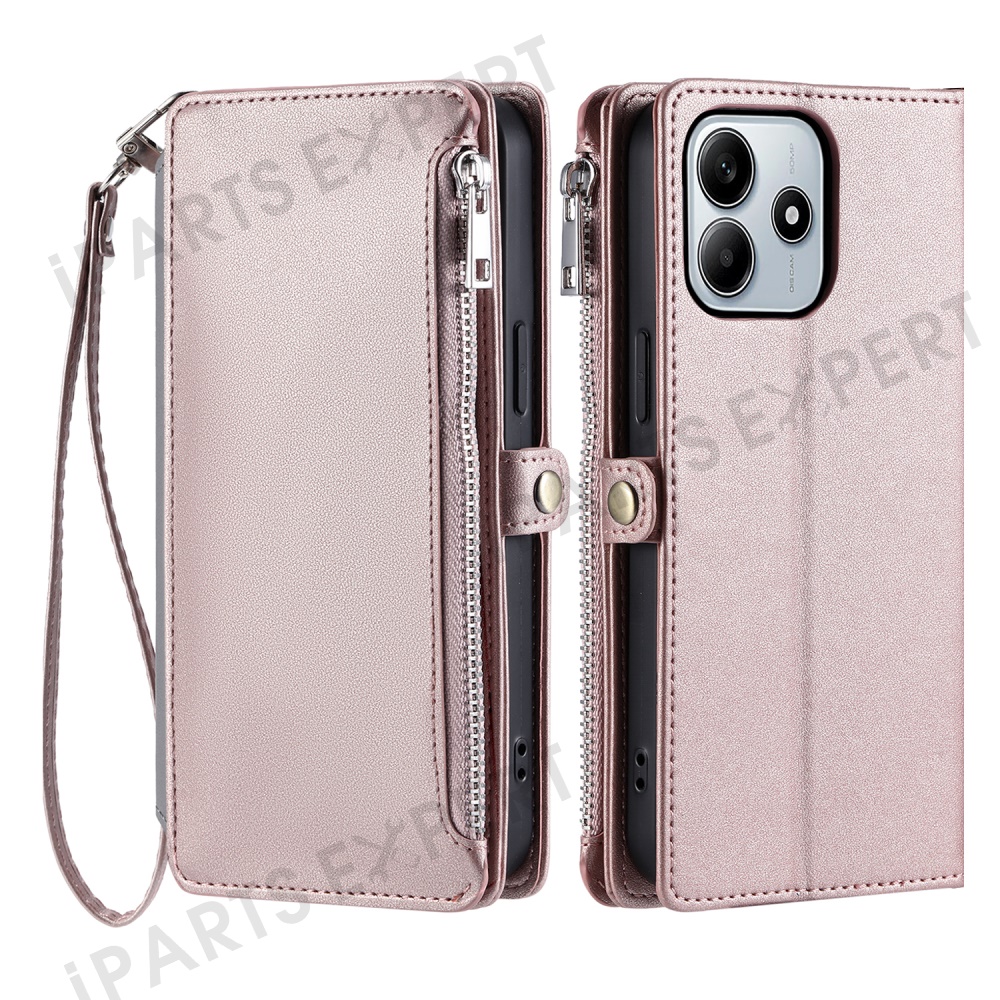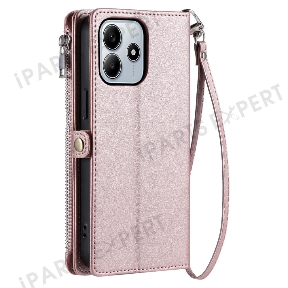 015 Style For Xiaomi Redmi Note 14 5G Case TPU+PU Leather Wallet Phone Cover with Straps - Rose Gold