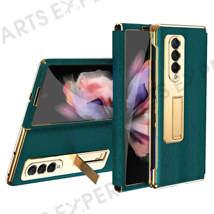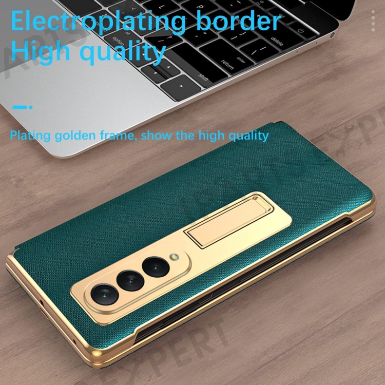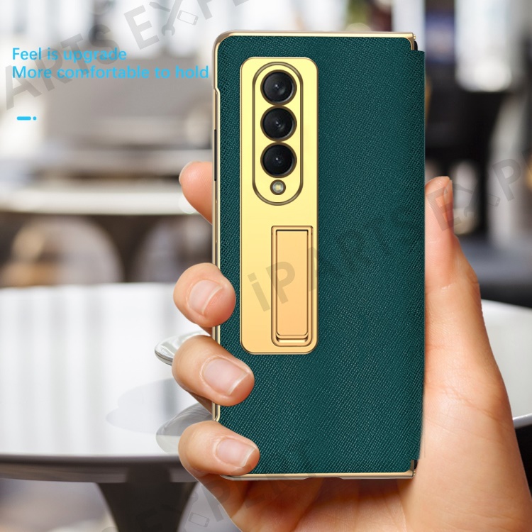 Anti-drop Back Cover For Samsung Galaxy Z Fold3 5G, Electroplating Cross Texture Phone Case Kickstand with Tempered Glass Film - Green