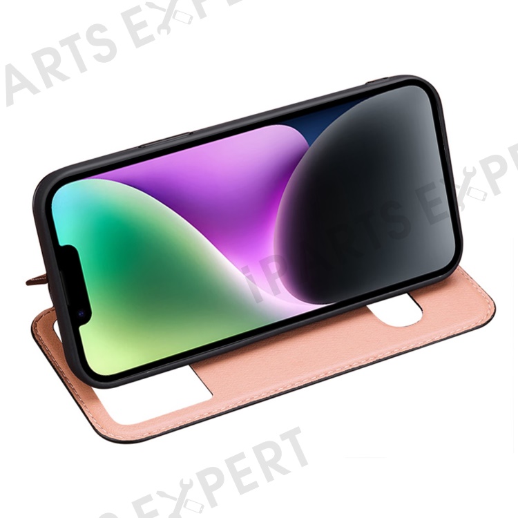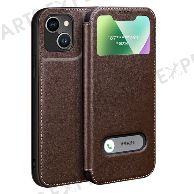 Anti-Fall Phone Case for iPhone 14 Plus Folio Flip Protective Cover Genuine Cowhide Leather Phone Stand Case with Dual Window View - Brown