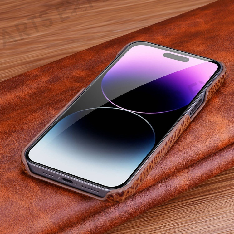 Anti-Fall Phone Case for iPhone 14 Pro Max Hard PC Protective Case Genuine Leather Coated Crocodile Texture Shockproof Cover - Coffee