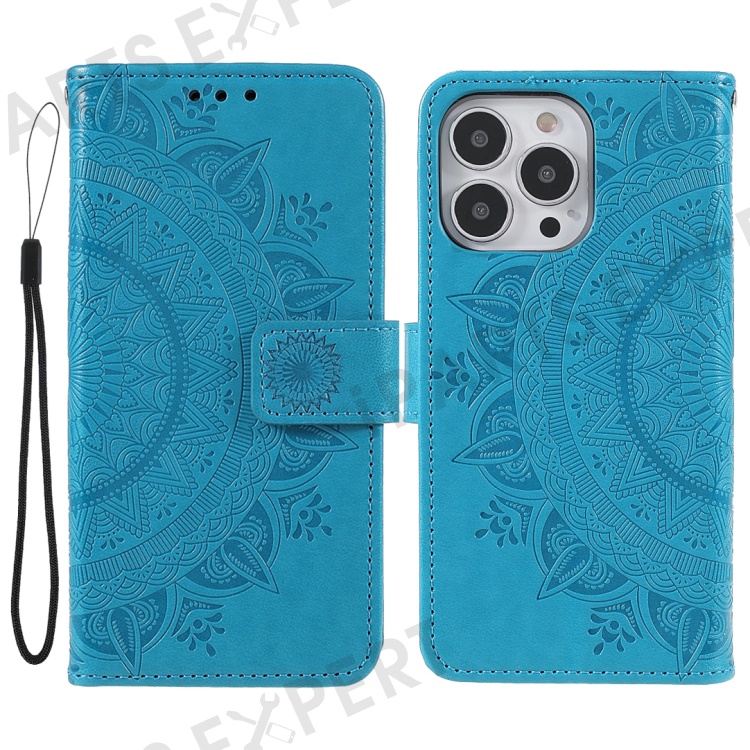 Anti-Scratch Imprinted Mandala Totem Pattern Leather Wallet Flip Protective Case Cover with Strap for iPhone 13 Pro Max 6.7 inch - Blue
