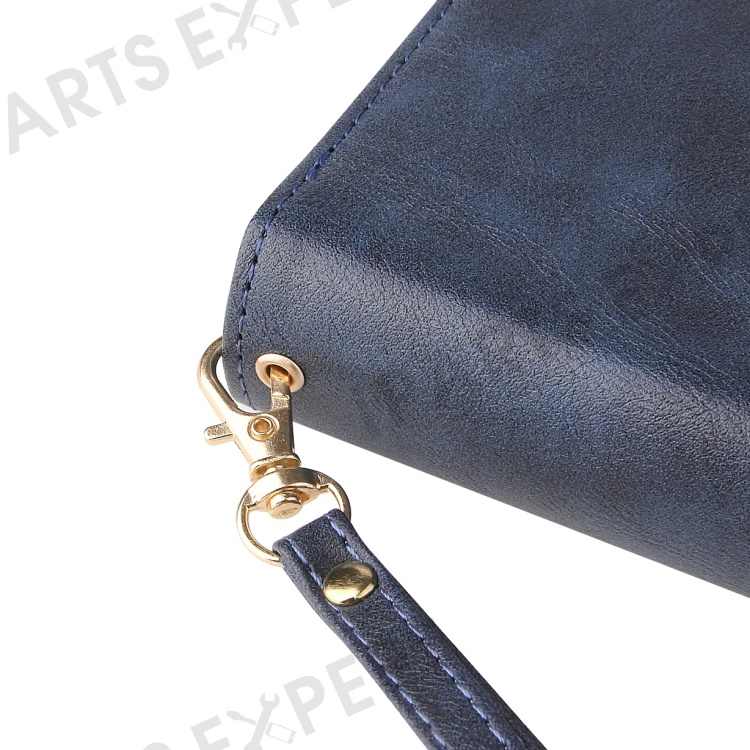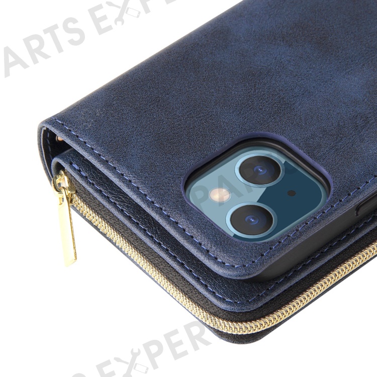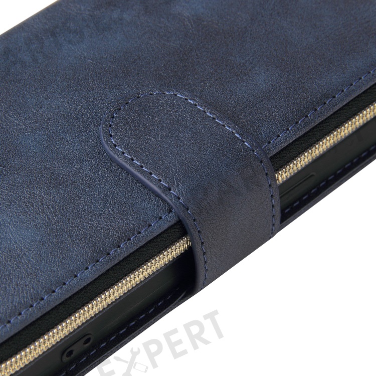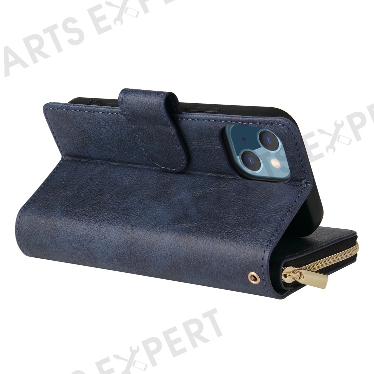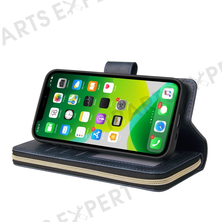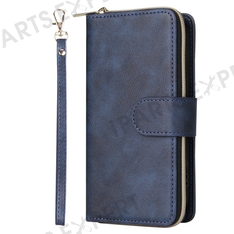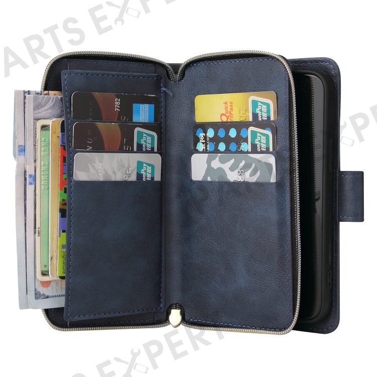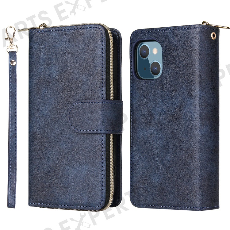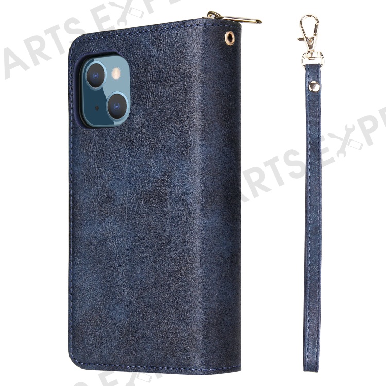 Anti-scratch PU Leather Phone Case For iPhone 14 Plus, 9 Card Holder Slots Magnetic Closure Zipper Pocket Flip Wallet Cover Stand with Strap - Blue