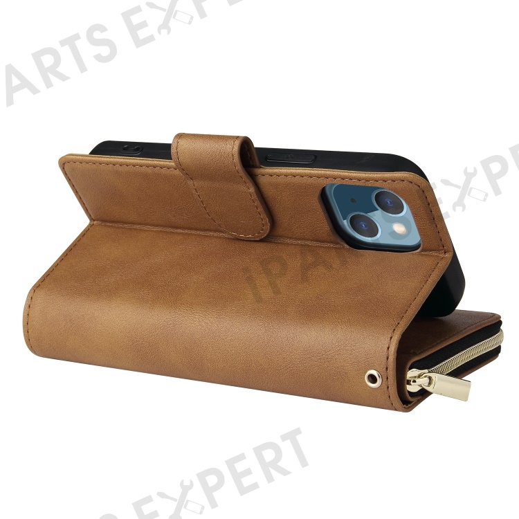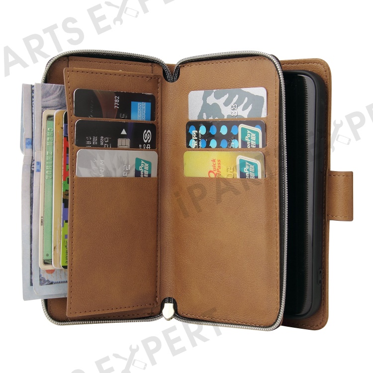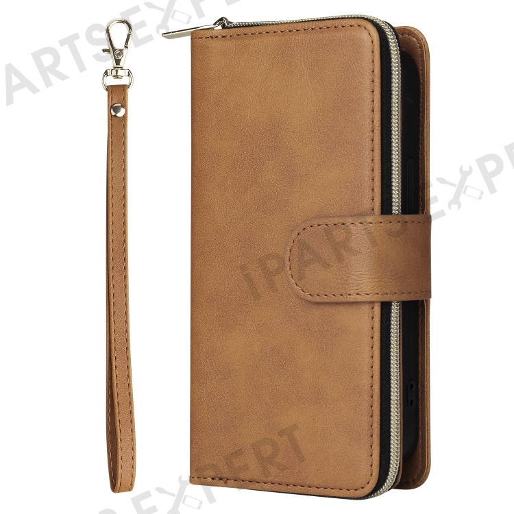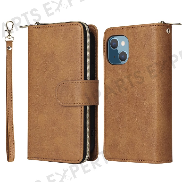 Anti-scratch PU Leather Phone Case For iPhone 14 Plus, 9 Card Holder Slots Magnetic Closure Zipper Pocket Flip Wallet Cover Stand with Strap - Brown