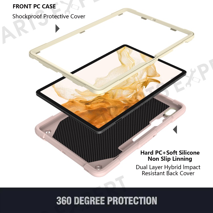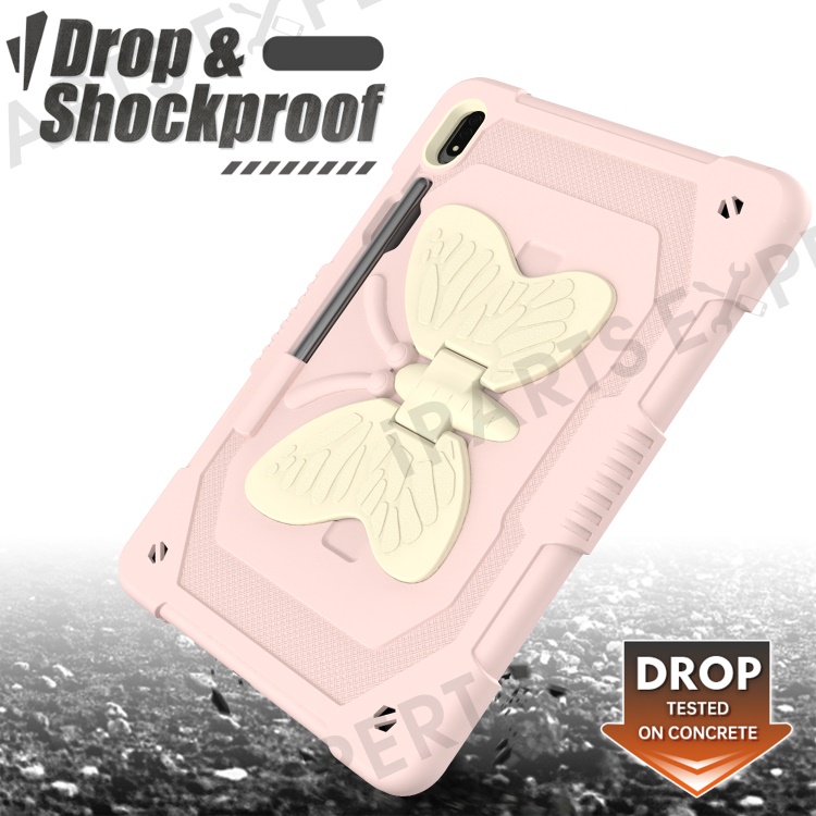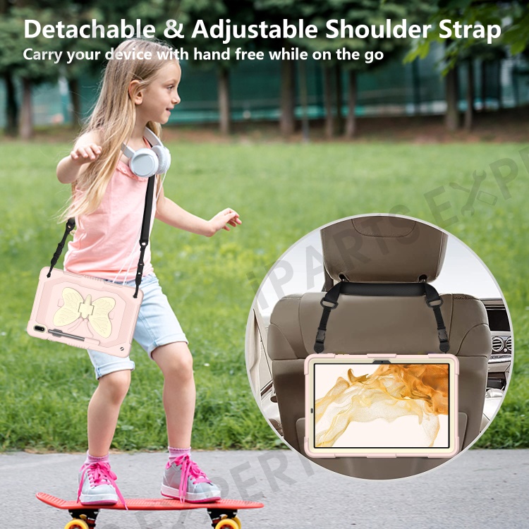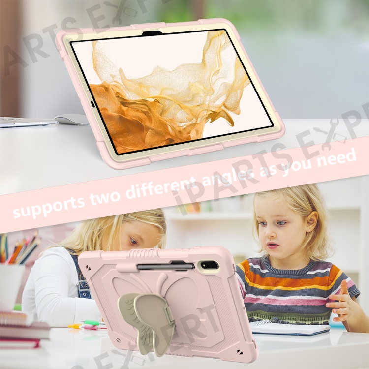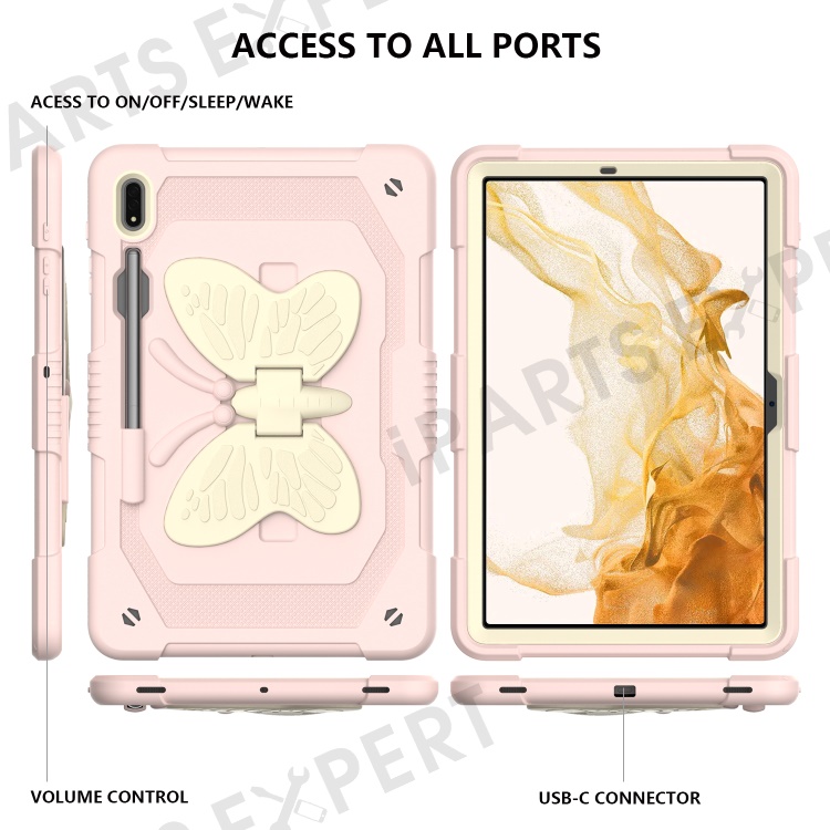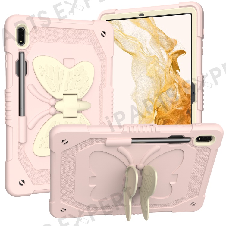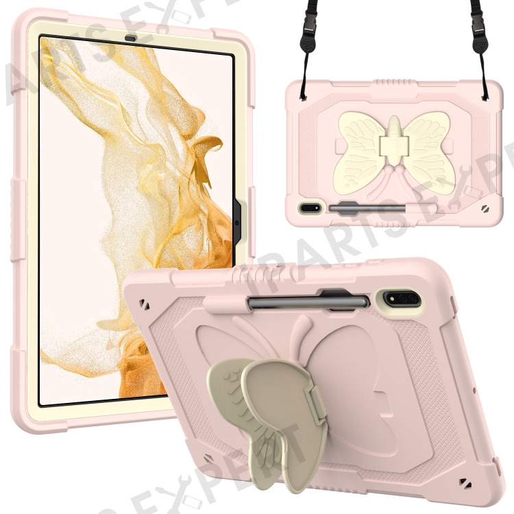 Anti-scratch Silicone + PC Tablet Case for Samsung Galaxy Tab S9 Butterfly Shape Kickstand Cover with Shoulder Strap - Beige / Rose Pink