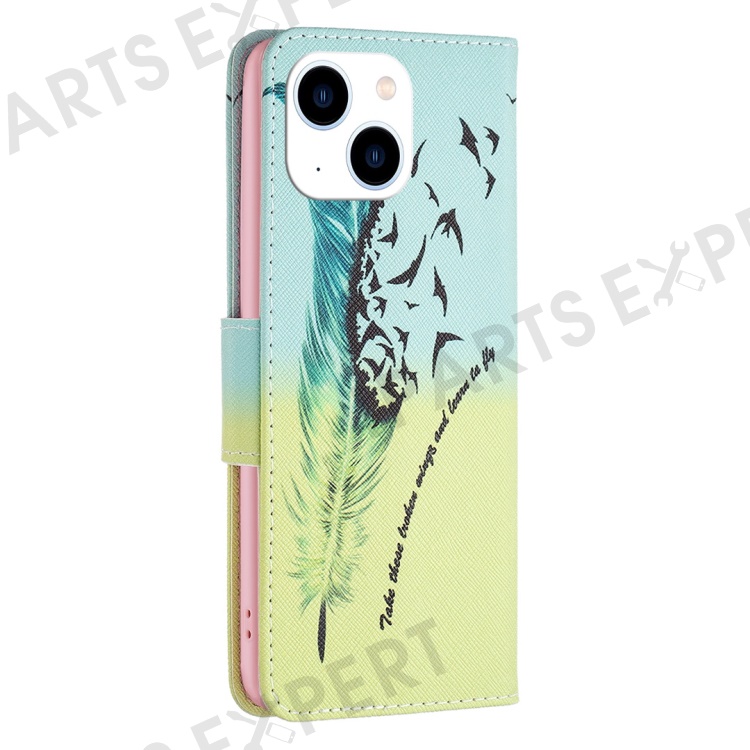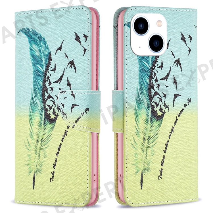 For iPhone 14 Phone Case Pattern Printing PU Leather Wallet Stand Cover - Feather