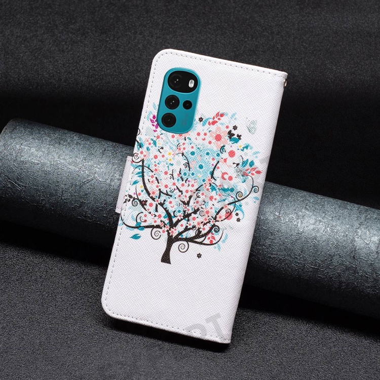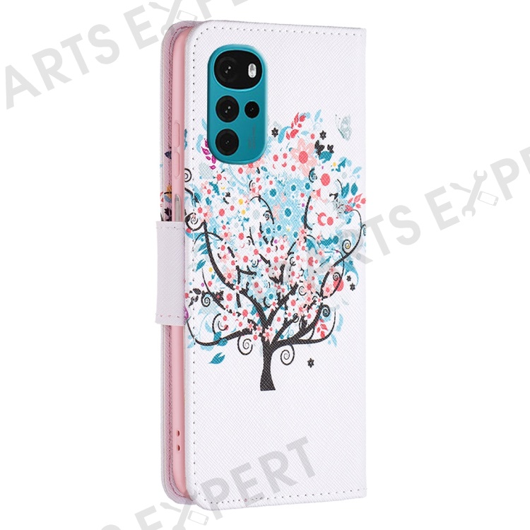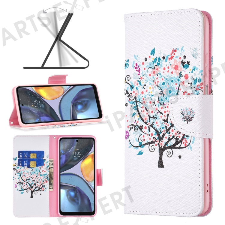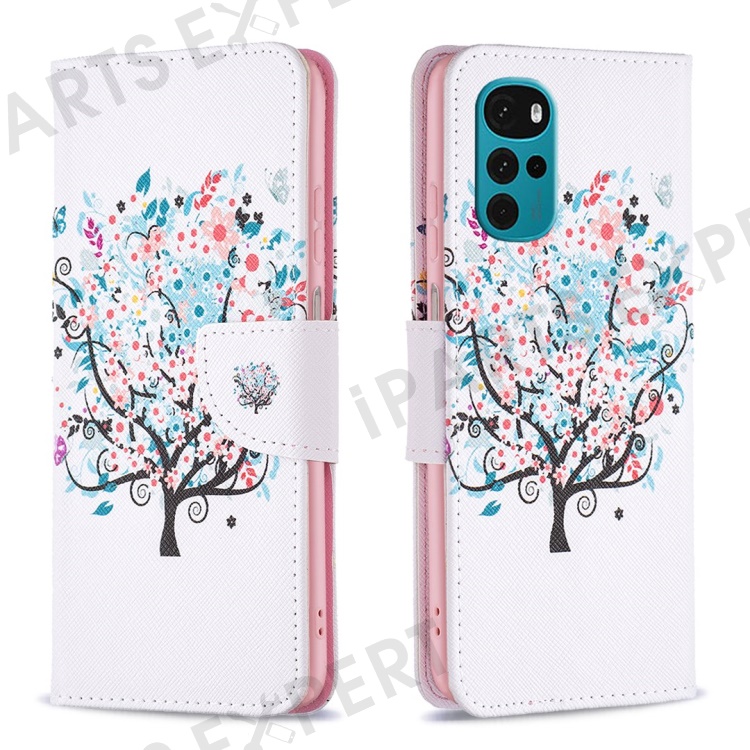 For Motorola Moto G22 Phone Case Pattern Printing PU Leather Wallet Stand Cover - Flower Tree