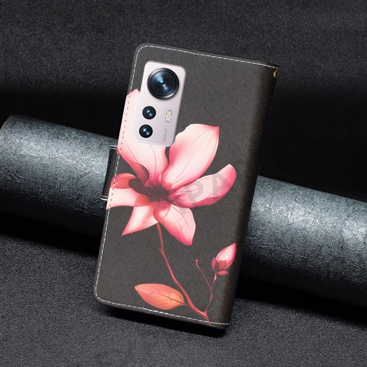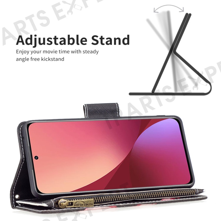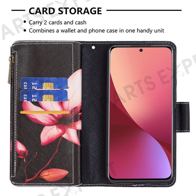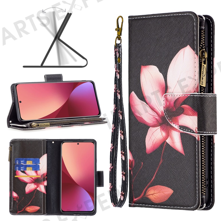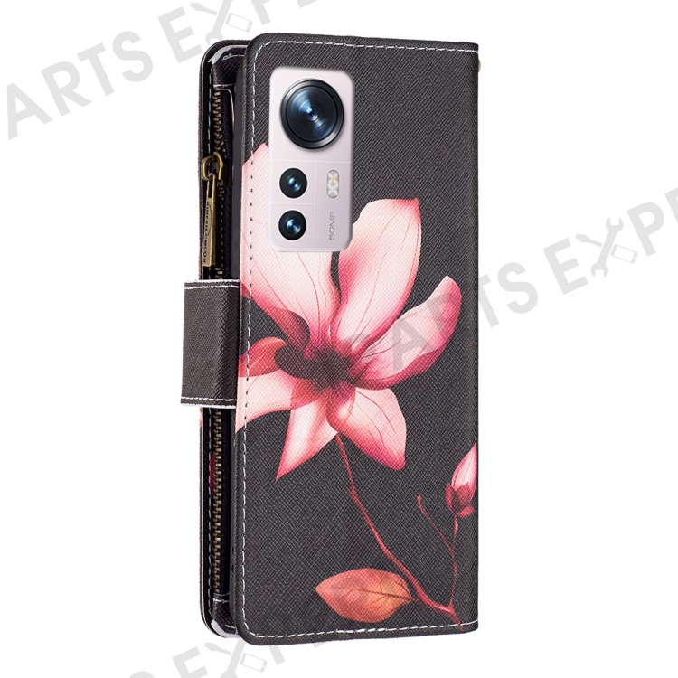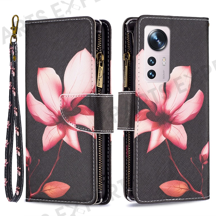 BF03 Pattern Printing Zipper Leather Case for Xiaomi 12 5G / 12X 5G / 12S 5G, Magnetic Closure Wallet Stand Soft TPU Book Cover with Strap - Flower