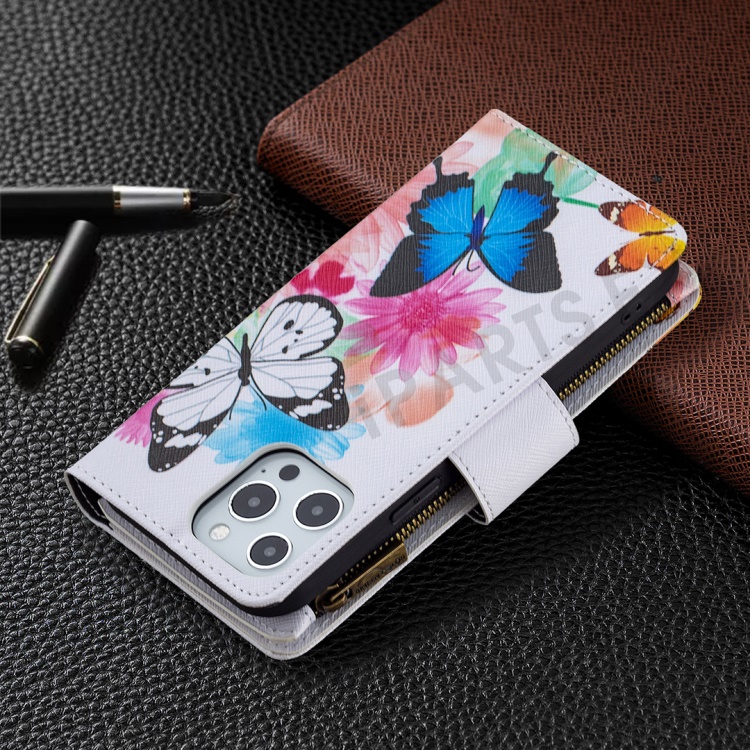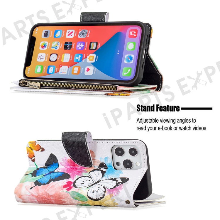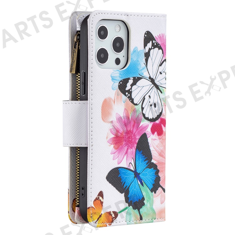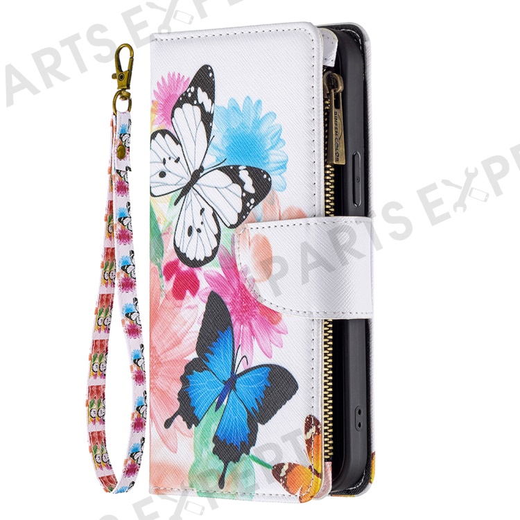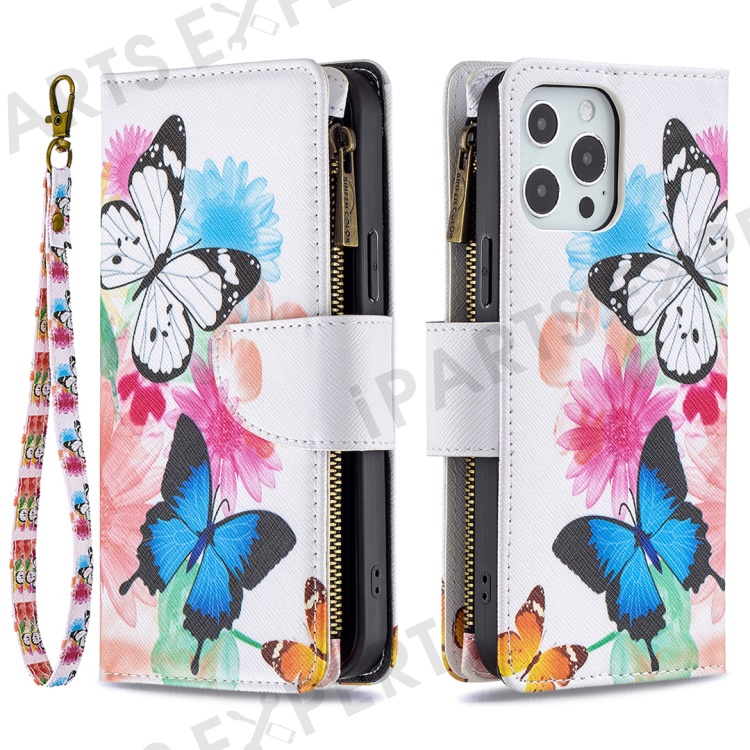 BF03 Stylish Pattern Printing 360° Protection Leather Stand Phone Cover with Wrist Strap and Zippered Wallet for iPhone 13 Pro Max 6.7 inch - Two Butterflies