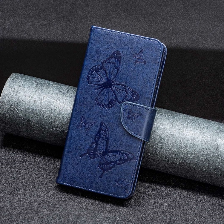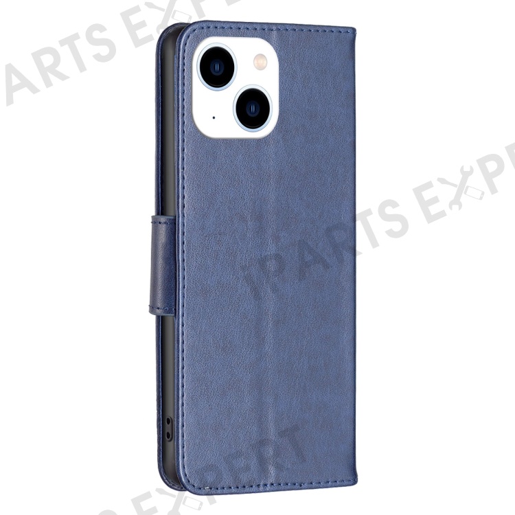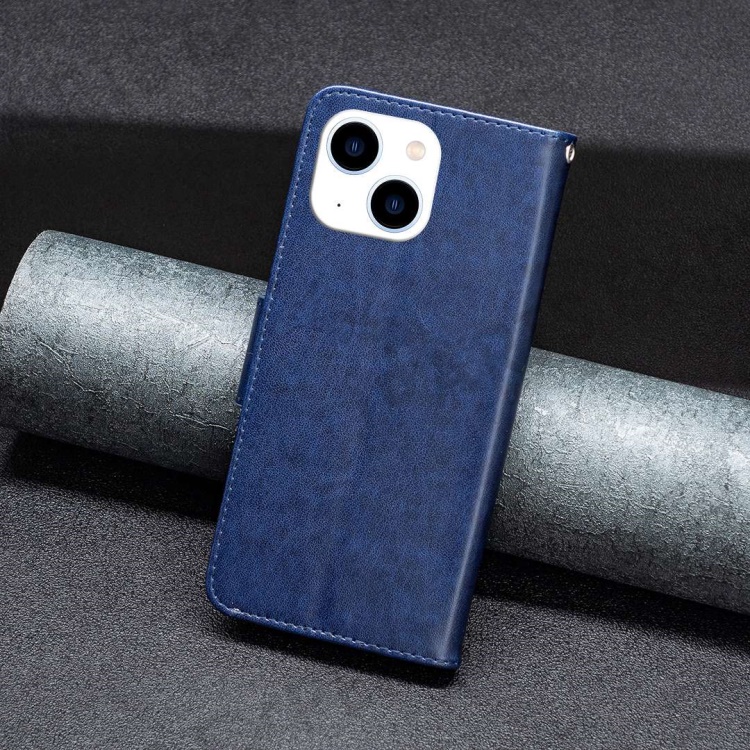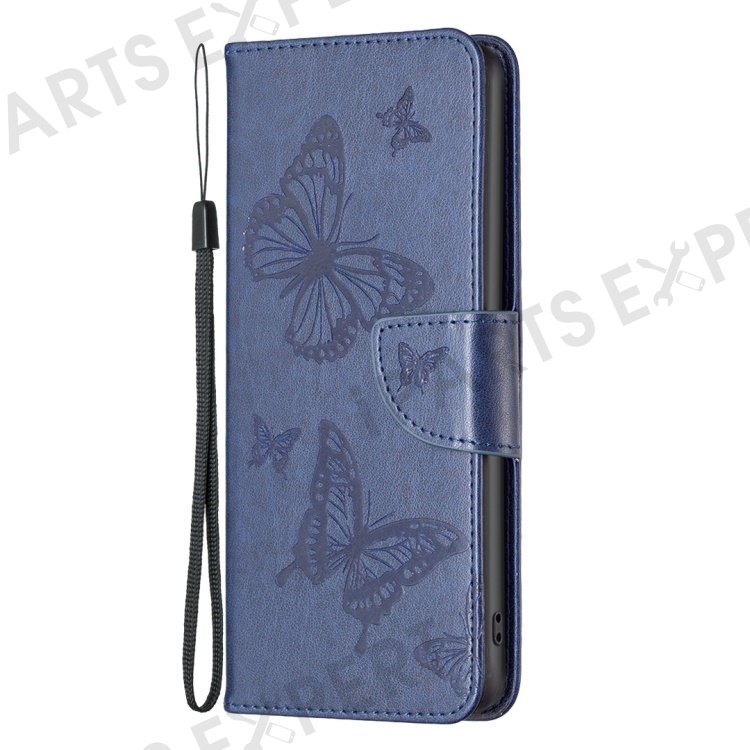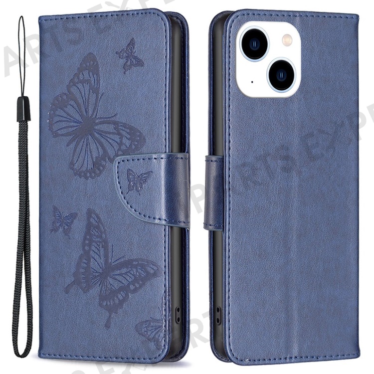 For iPhone 14 Wallet Case Imprinted Butterflies Leather Phone Cover with Strap - Dark Blue
