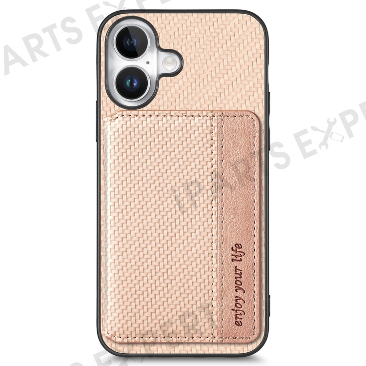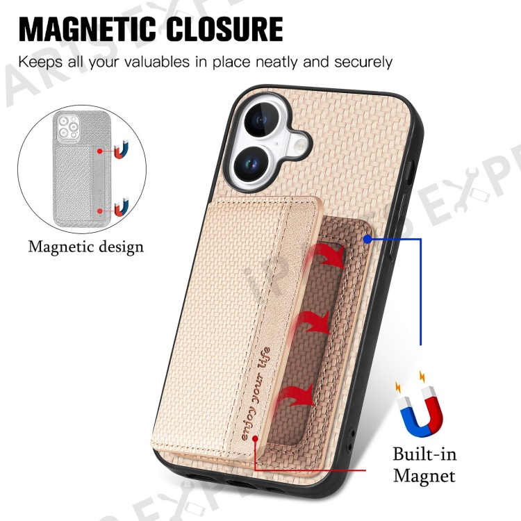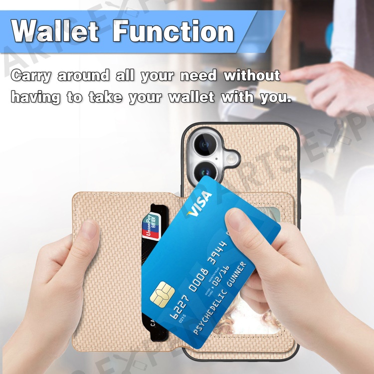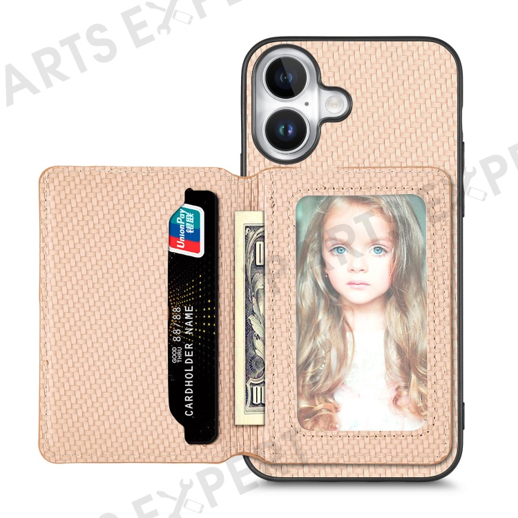 C1-02 For iPhone 16 Case RFID Blocking Card Holder Carbon Fiber Leather+PC+TPU Phone Cover - Apricot