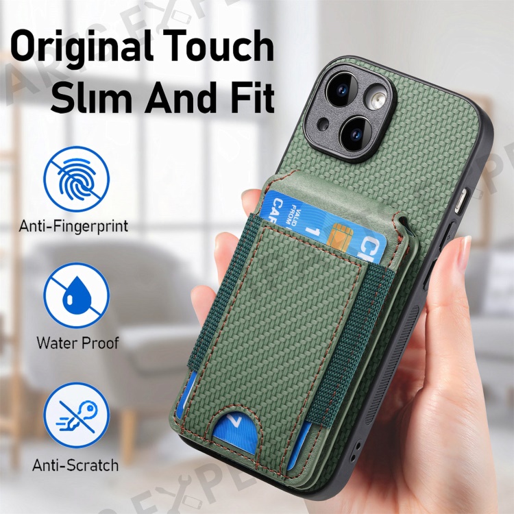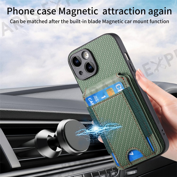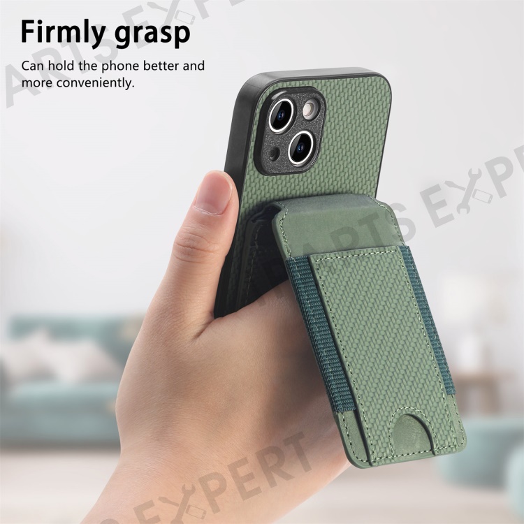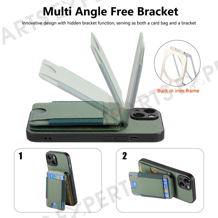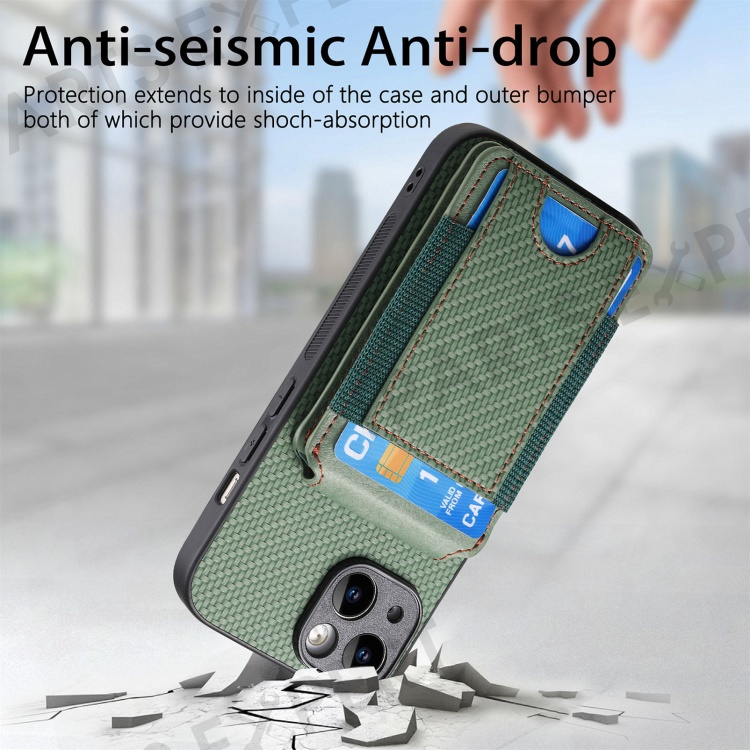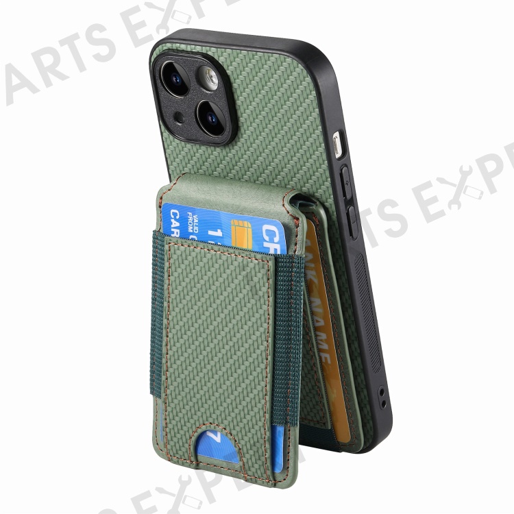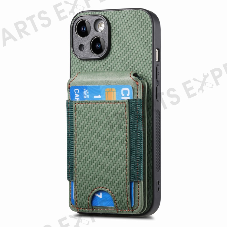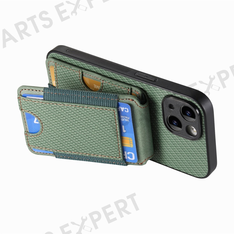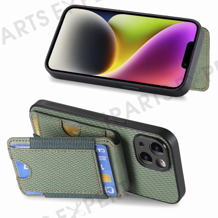 C1-12 For iPhone 14 Case Card Slots Kickstand Leather Carbon Fiber Texture Back Cover - Green