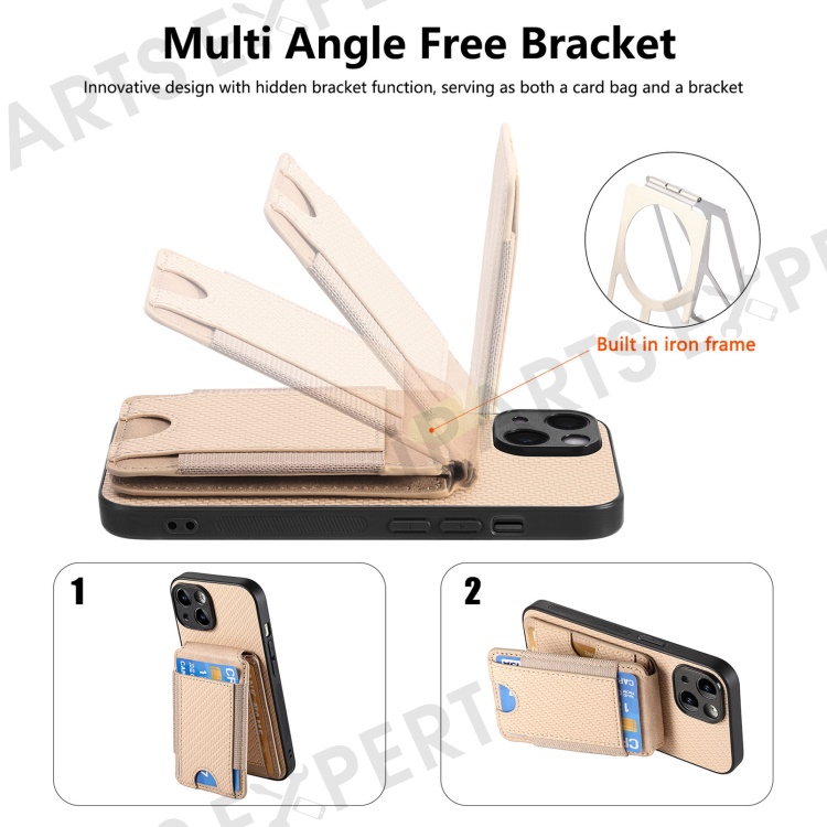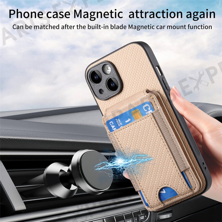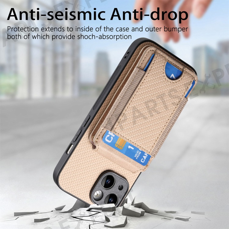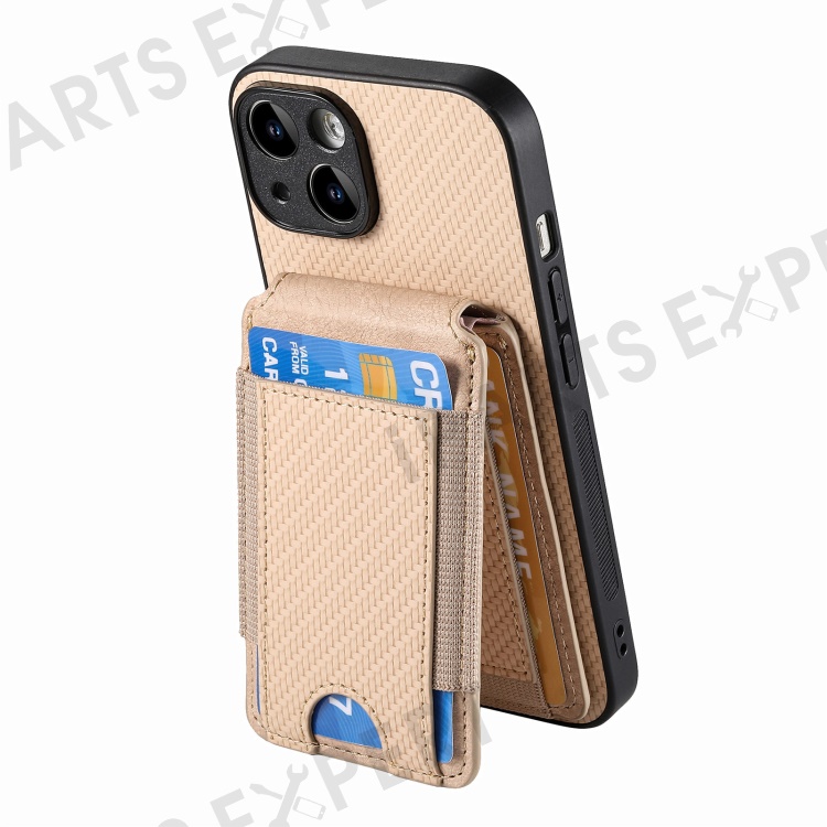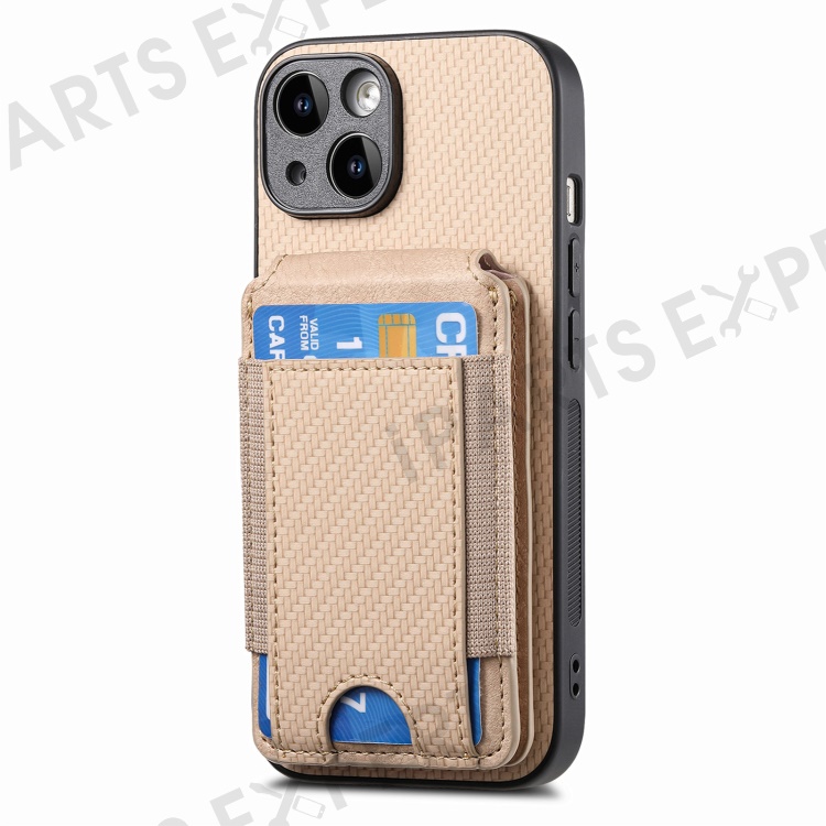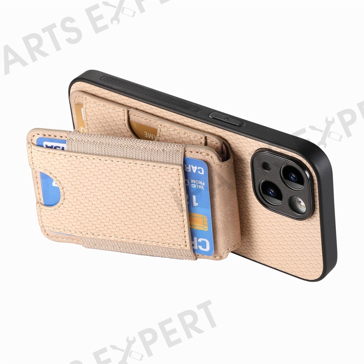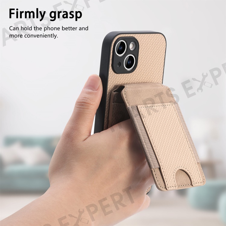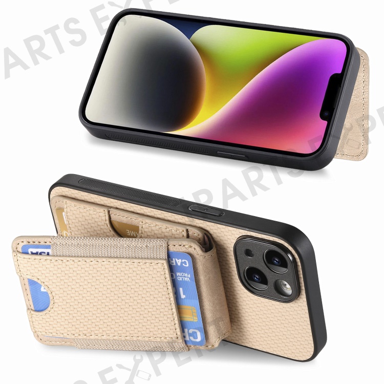 C1-12 For iPhone 14 Case Card Slots Kickstand Leather Carbon Fiber Texture Back Cover - Khaki