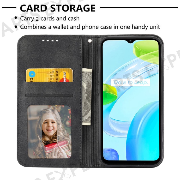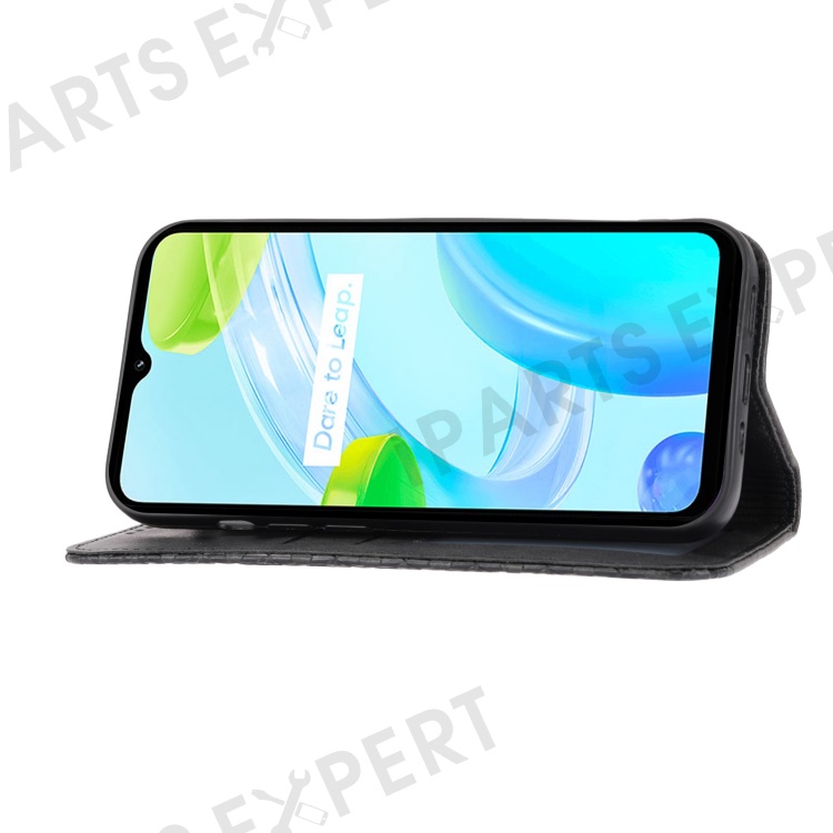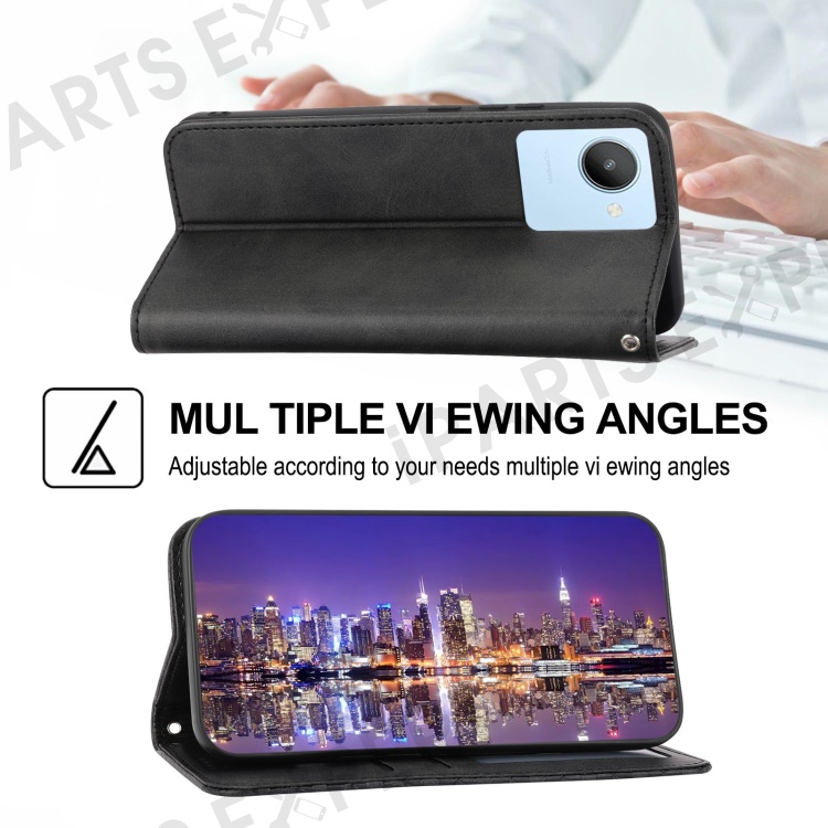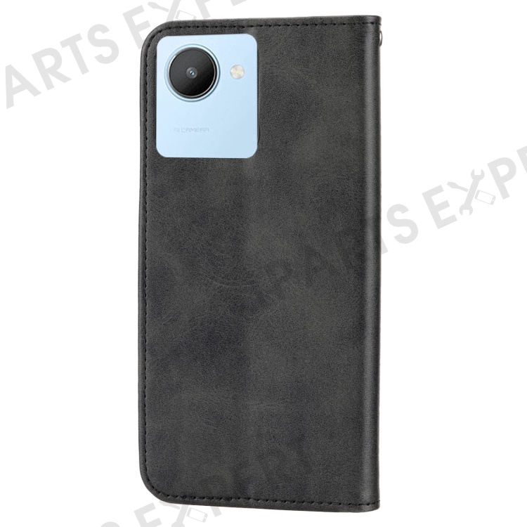Calf Texture Phone Case for Realme C30 4G, PU Leather Imprinted Rhombus Pattern Wallet Stand Folio Flip Cover with Strap - Black
