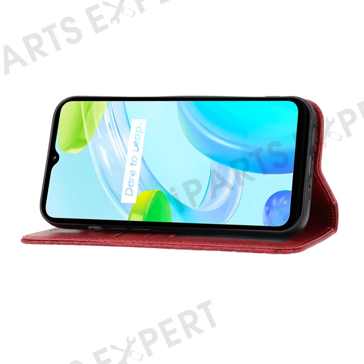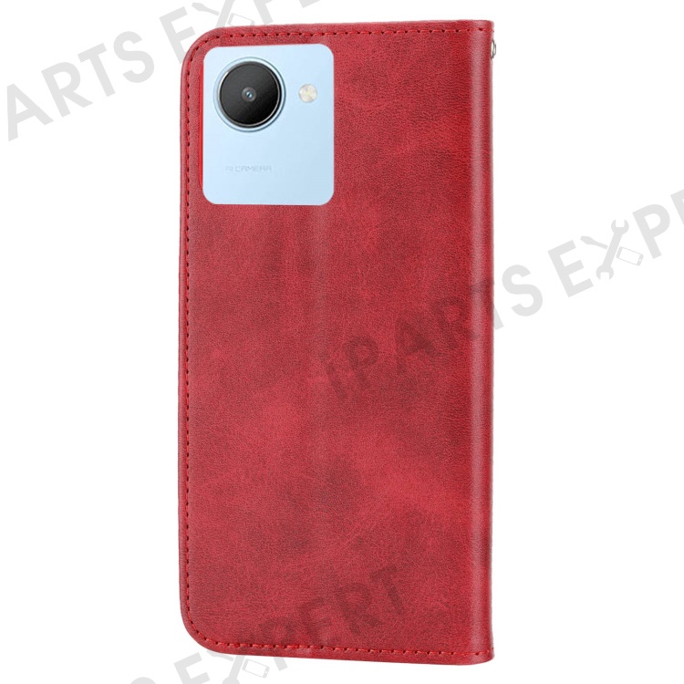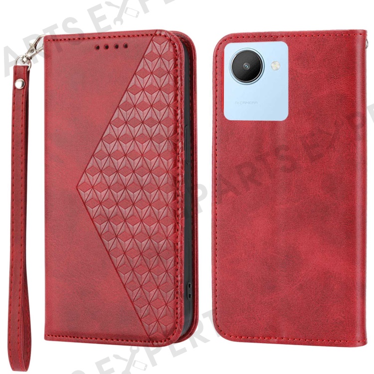 Calf Texture Phone Case for Realme C30 4G, PU Leather Imprinted Rhombus Pattern Wallet Stand Folio Flip Cover with Strap - Red