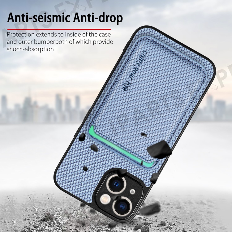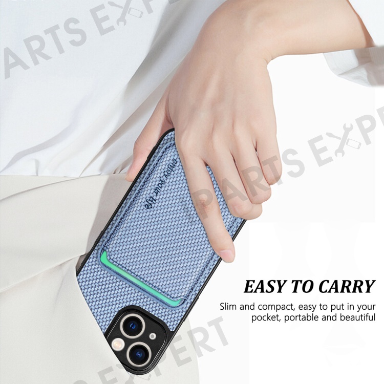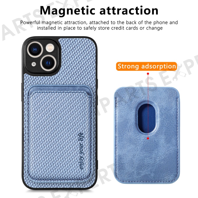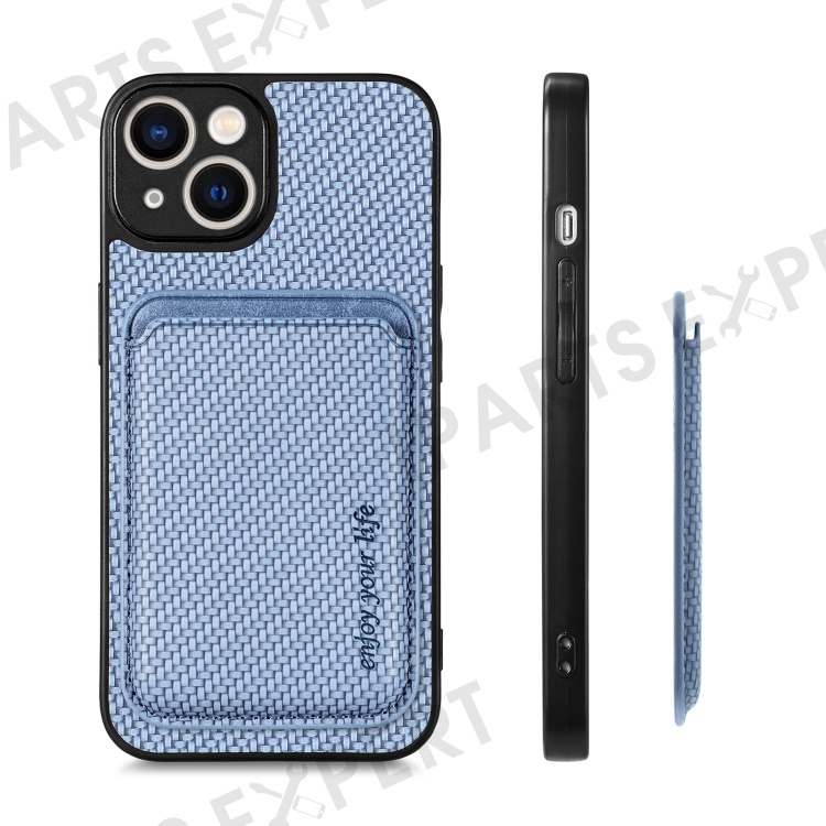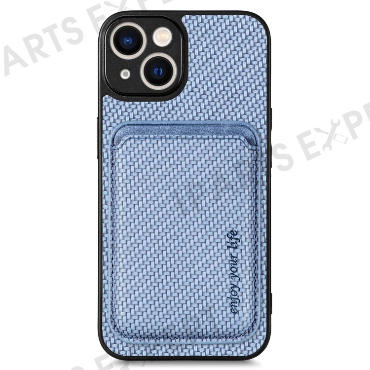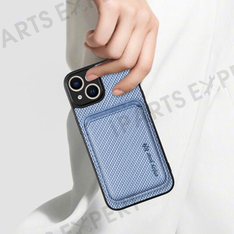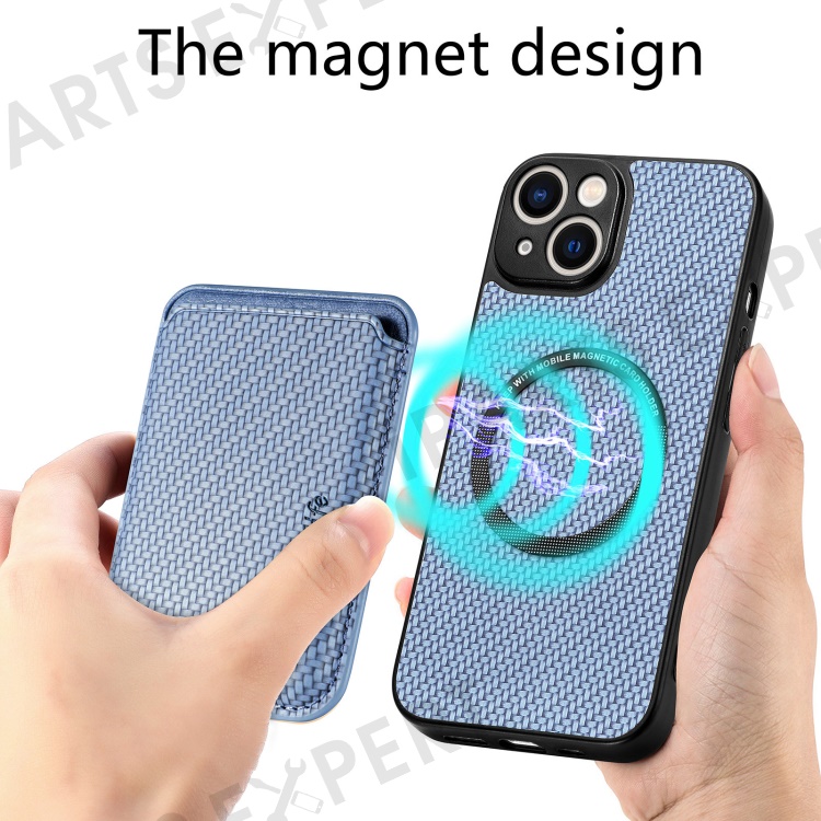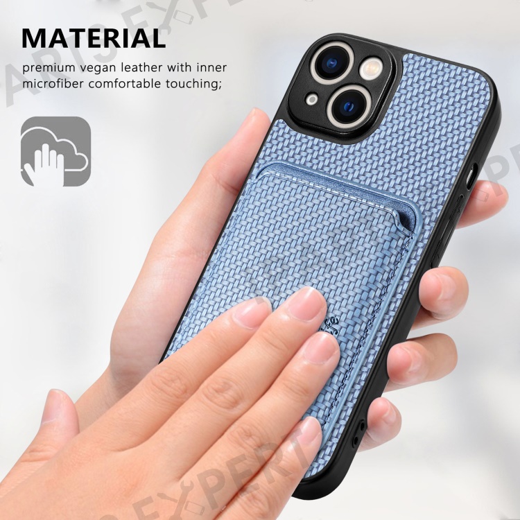 Carbon Fiber Phone Case for iPhone 15 , Leather+PC+TPU Cover with Detachable Magnetic Card Holder - Blue