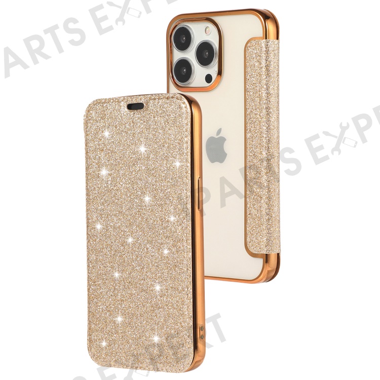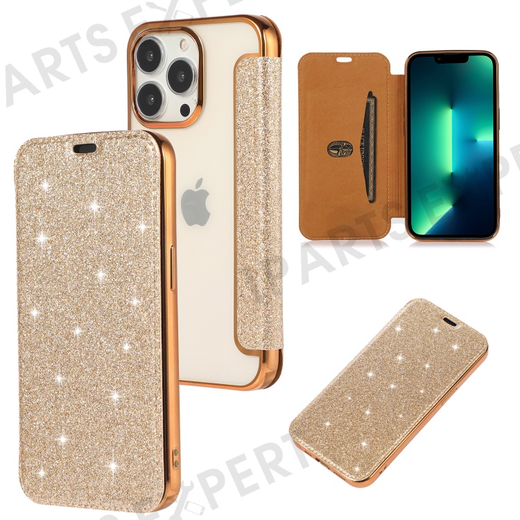 Card Holder Stand Case for iPhone 15 , Glitter Powder PU Leather+TPU Transparent Phone Cover - Gold
