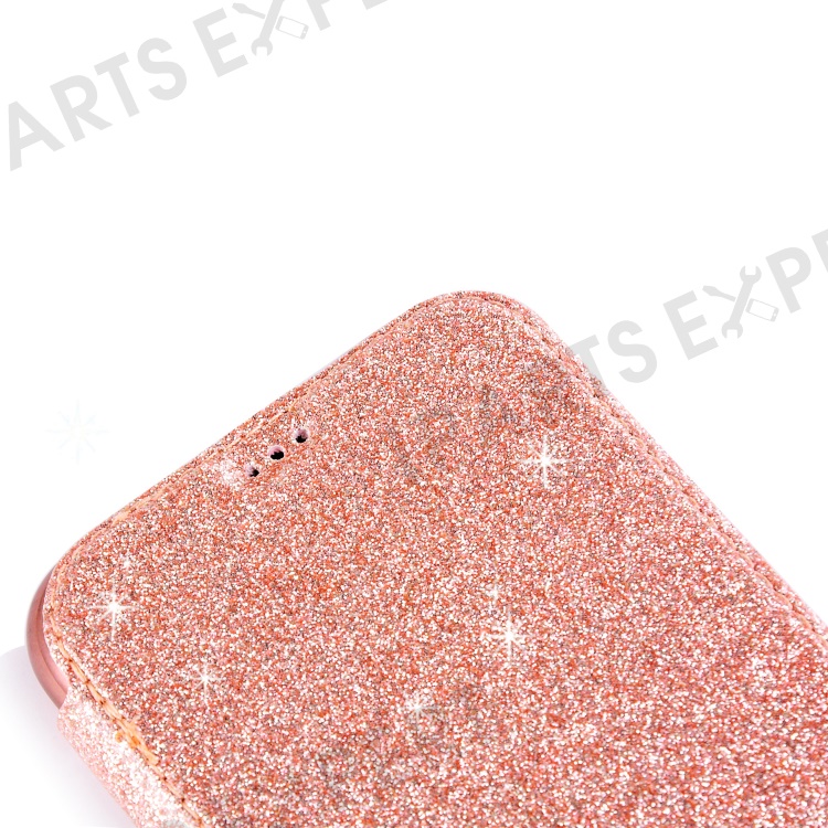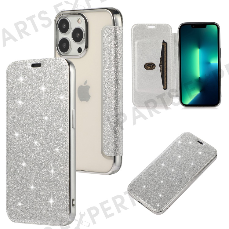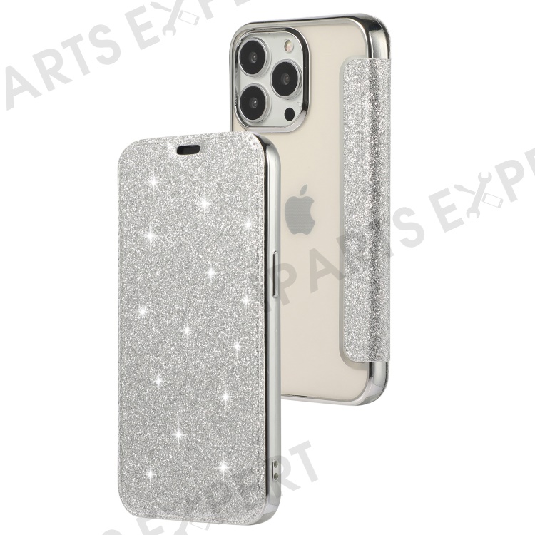 Card Holder Stand Case for iPhone 15 , Glitter Powder PU Leather+TPU Transparent Phone Cover - Silver