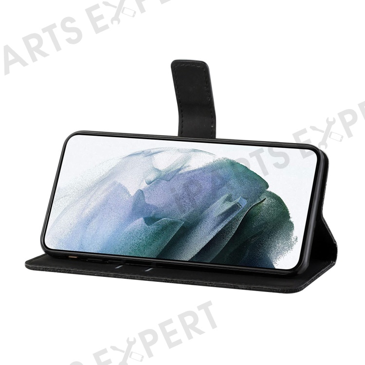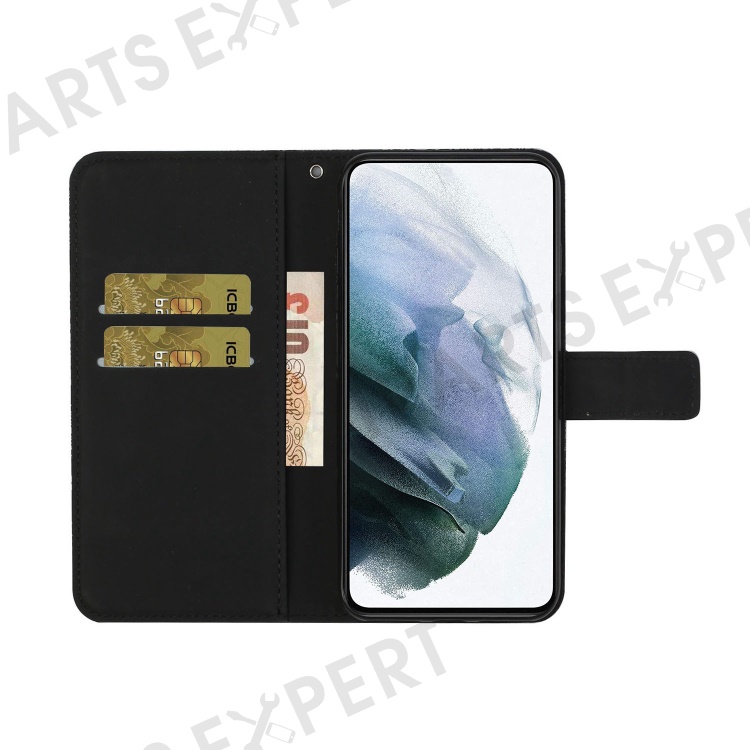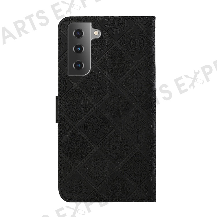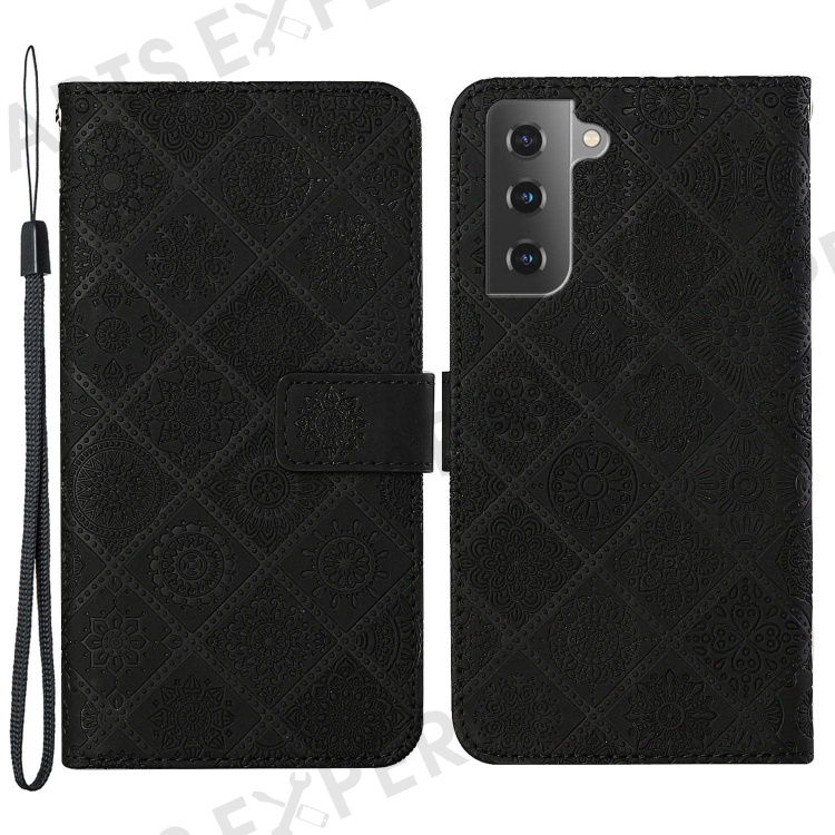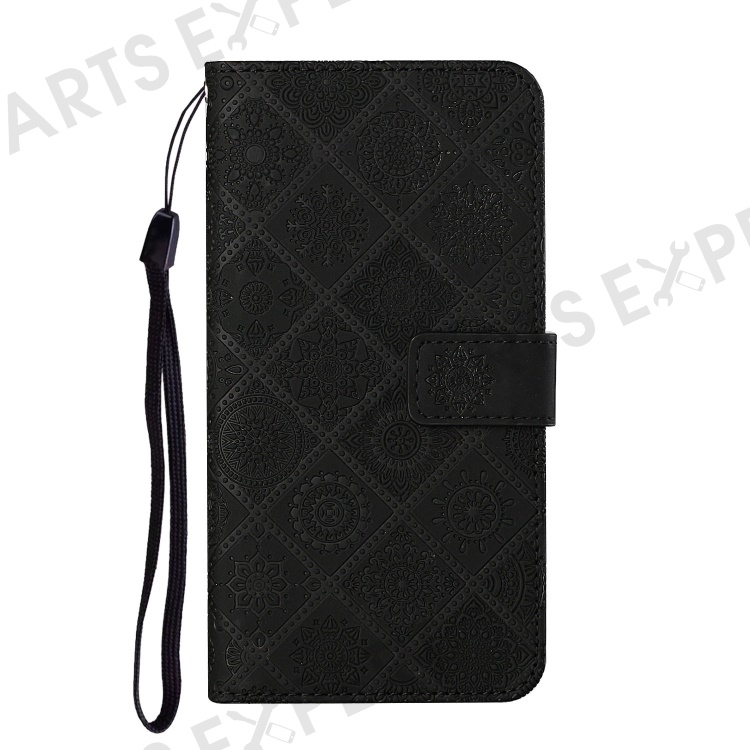 Cell Phone Case for Samsung Galaxy S23, PU Leather Wallet Ethnic Style Imprinted Flower Stand Cover with Strap - Black