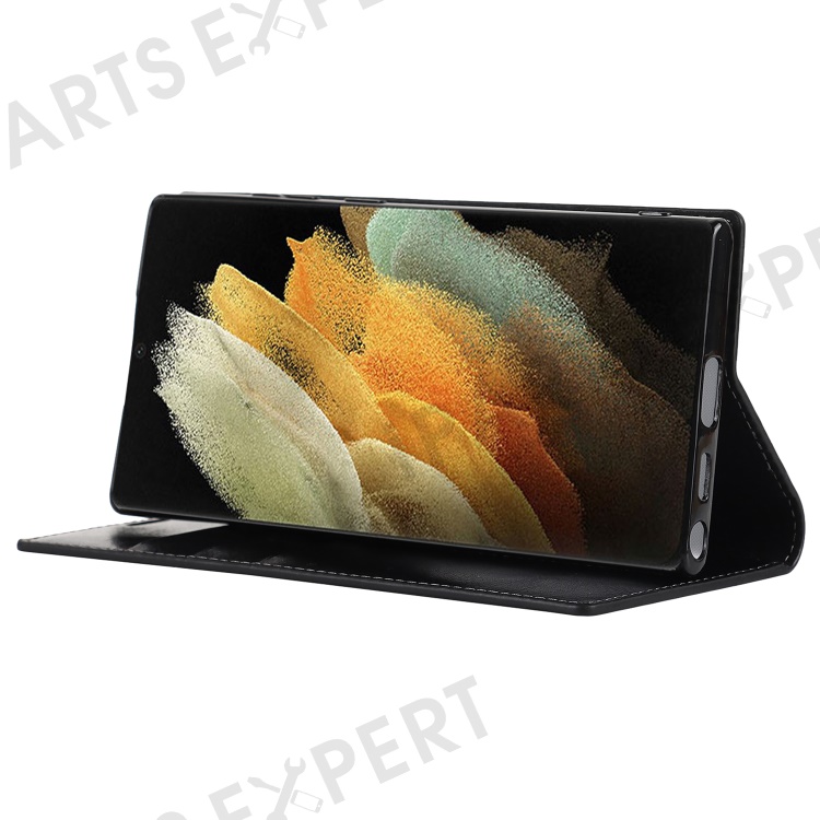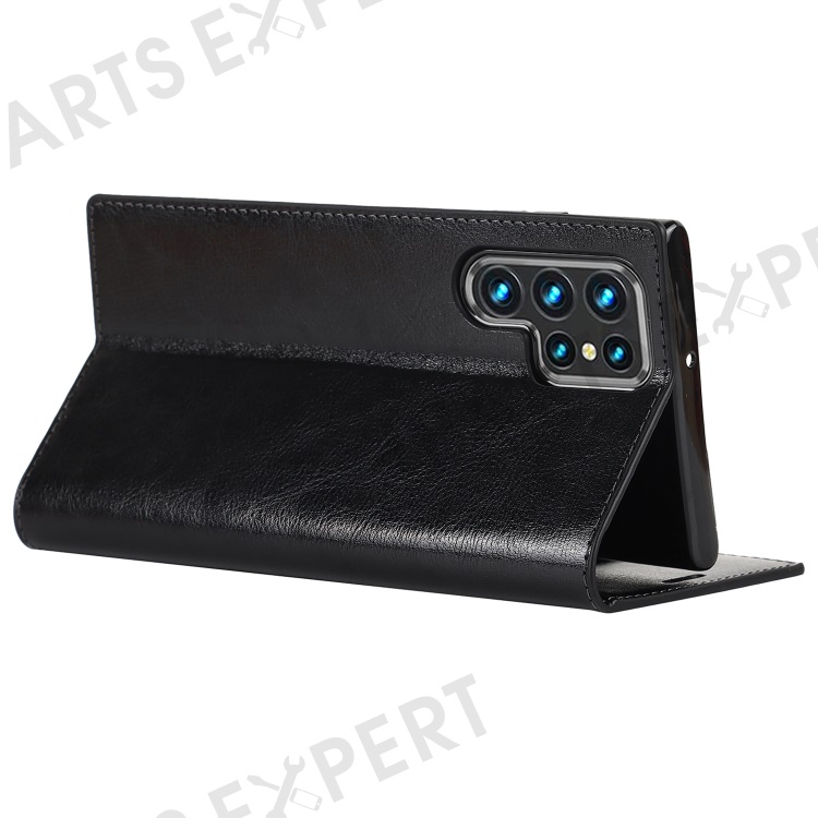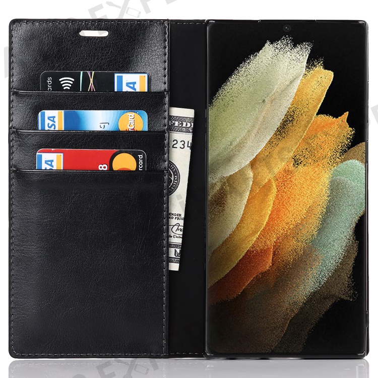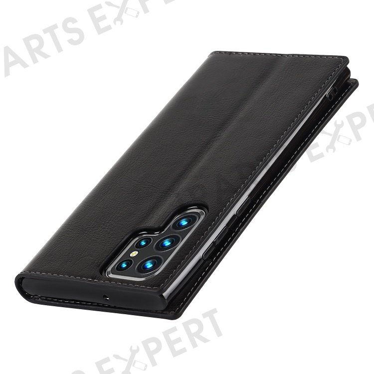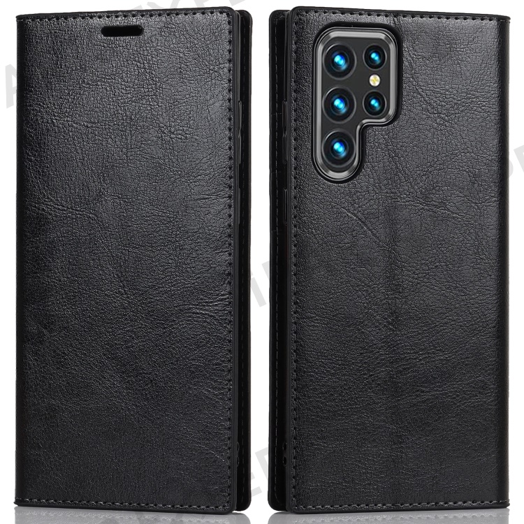 For Samsung Galaxy S22 Ultra 5G Crazy Horse Texture Genuine Leather + TPU Phone Case Cover with Stand Wallet - Black