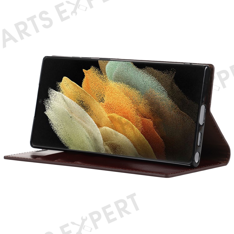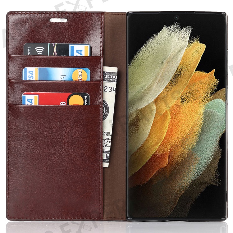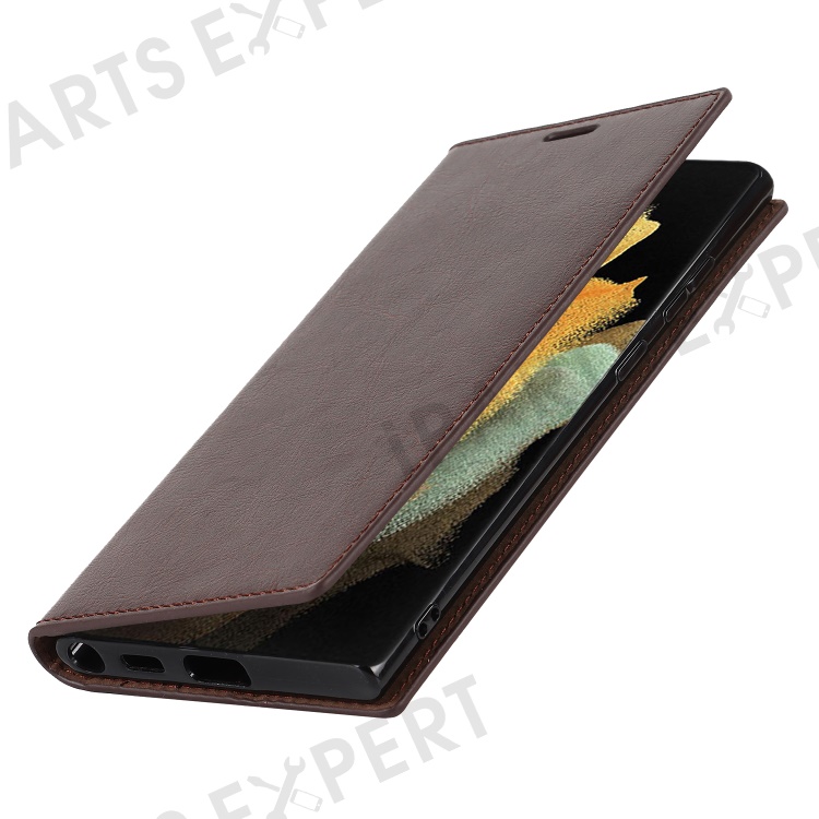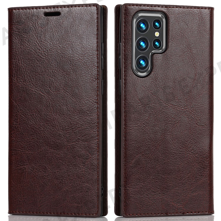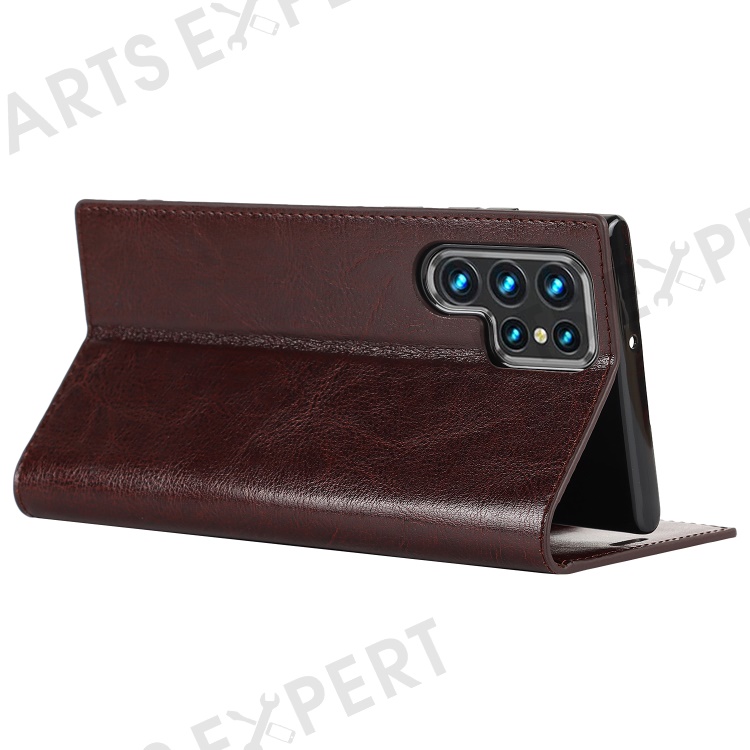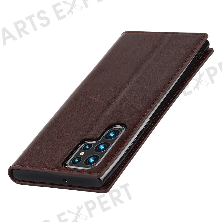 For Samsung Galaxy S22 Ultra 5G Crazy Horse Texture Genuine Leather + TPU Phone Case Cover with Stand Wallet - Coffee