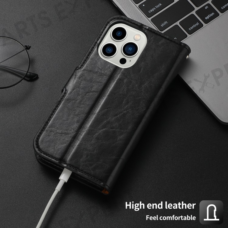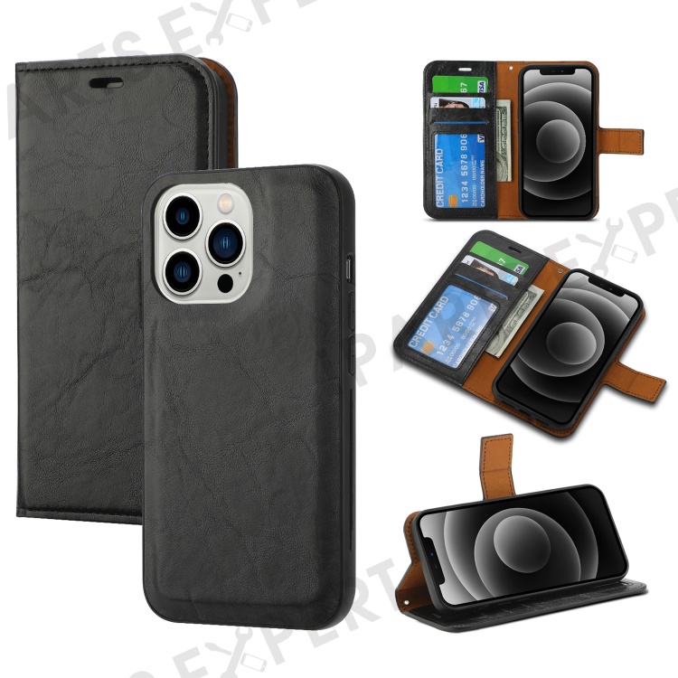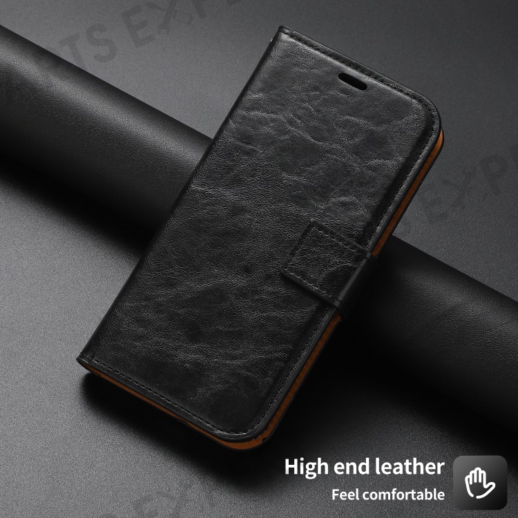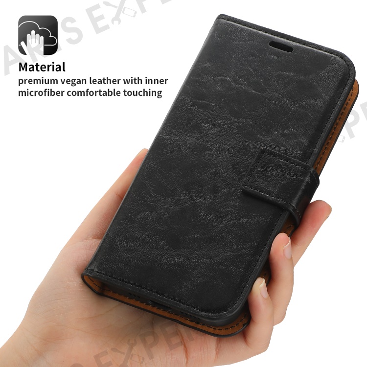 This case features a two-in-one design with a leather wallet cover and a detachable leather-coated TPU back case. Crazy horse texture PU leather outer core with fine stitches has a nice finish and touch.