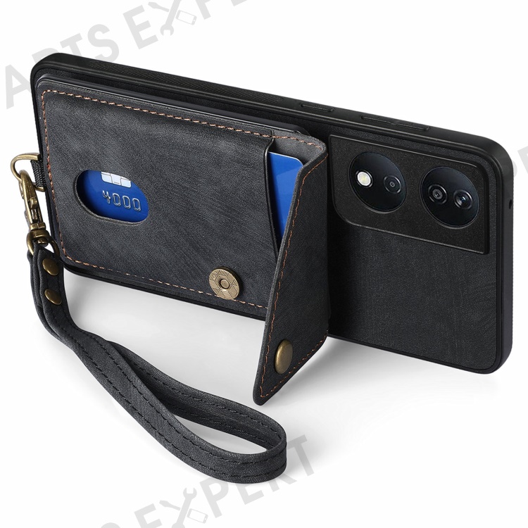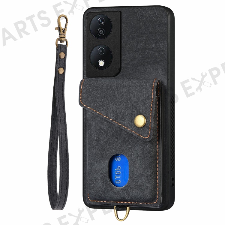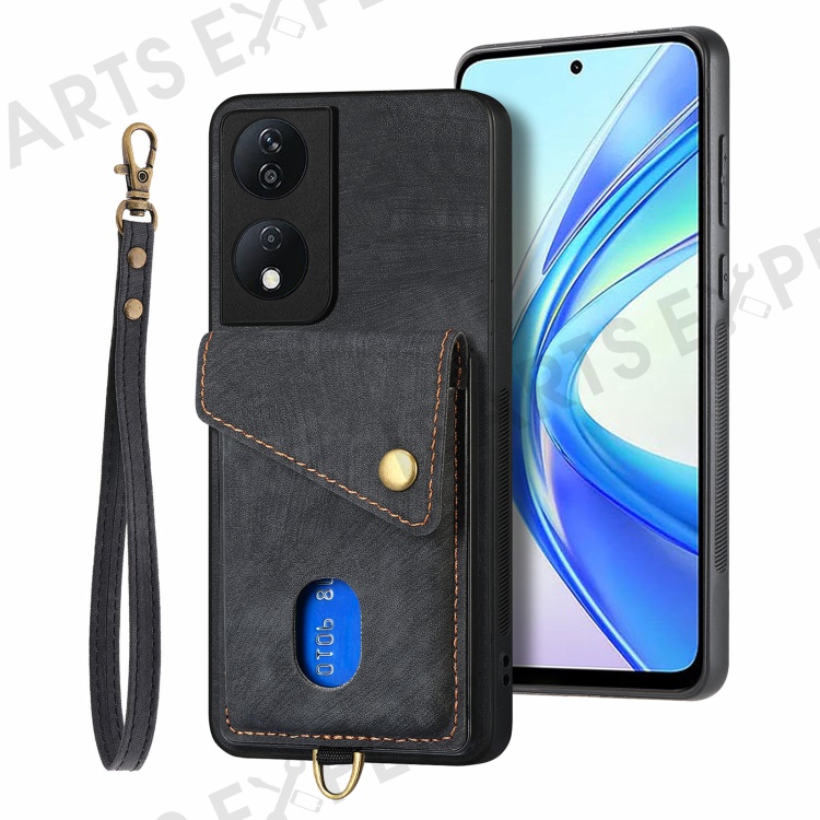 D1 For Honor X7b 4G / 90 Smart Case Leather + TPU Retro Phone Cover Handbag Card Holder - Black