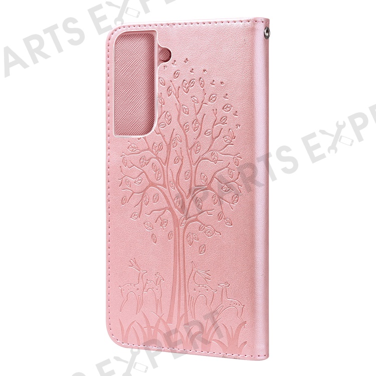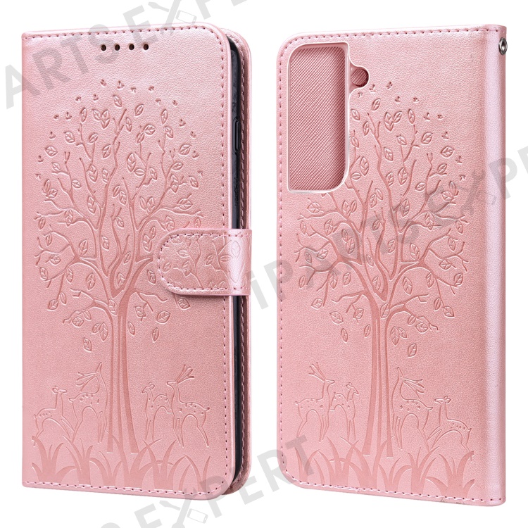 Deer and Tree Imprinting Stand Feature PU Leather Wallet Shockproof Flip Magnetic Case for Samsung Galaxy S22 5G - Pink
