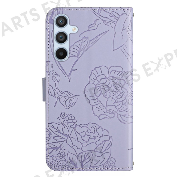 Drop-proof Phone Case HT03 For Samsung Galaxy A34 5G Butterfly Flowers Imprinted Skin-touch PU Leather Cover Wallet Stand with Shoulder Strap - Purple