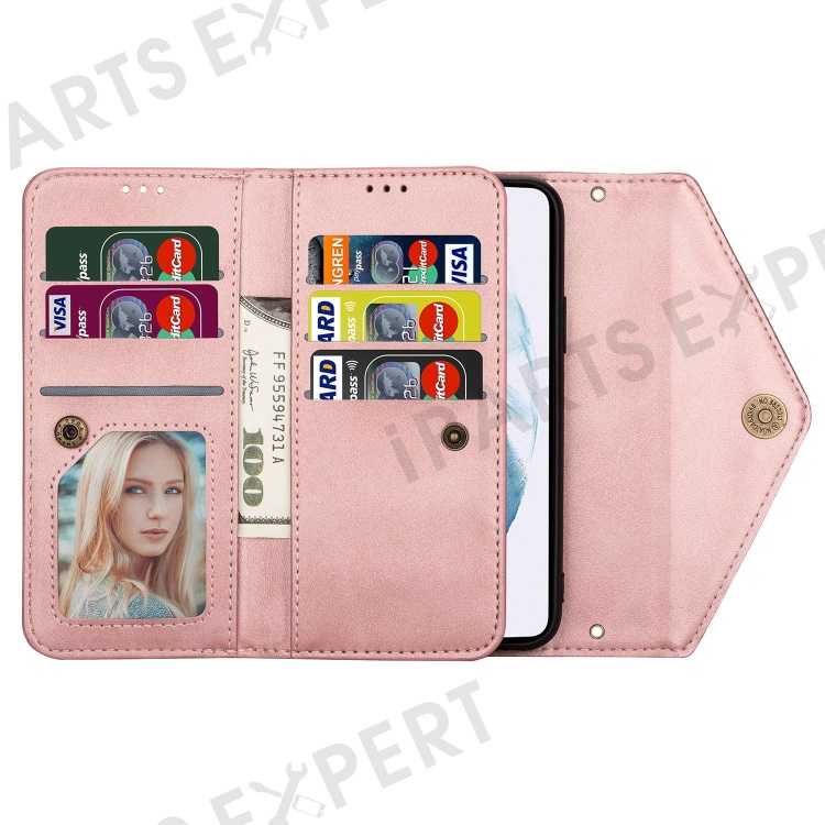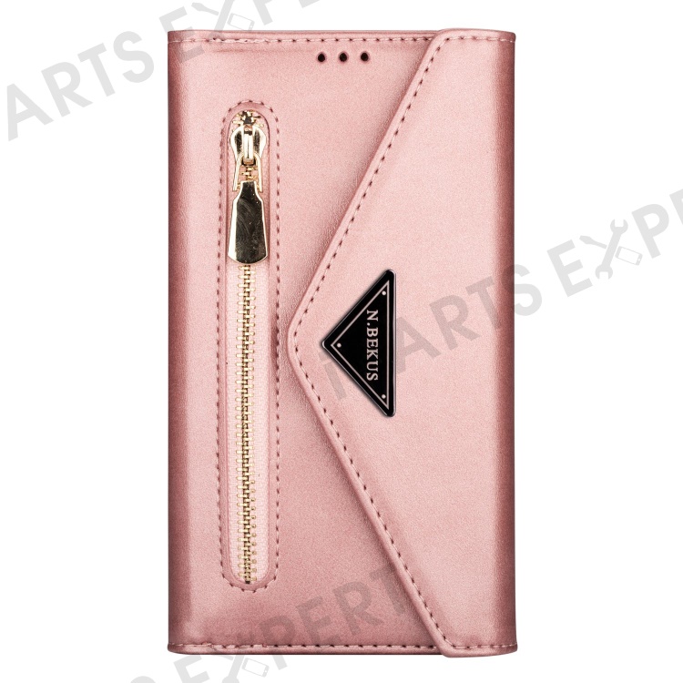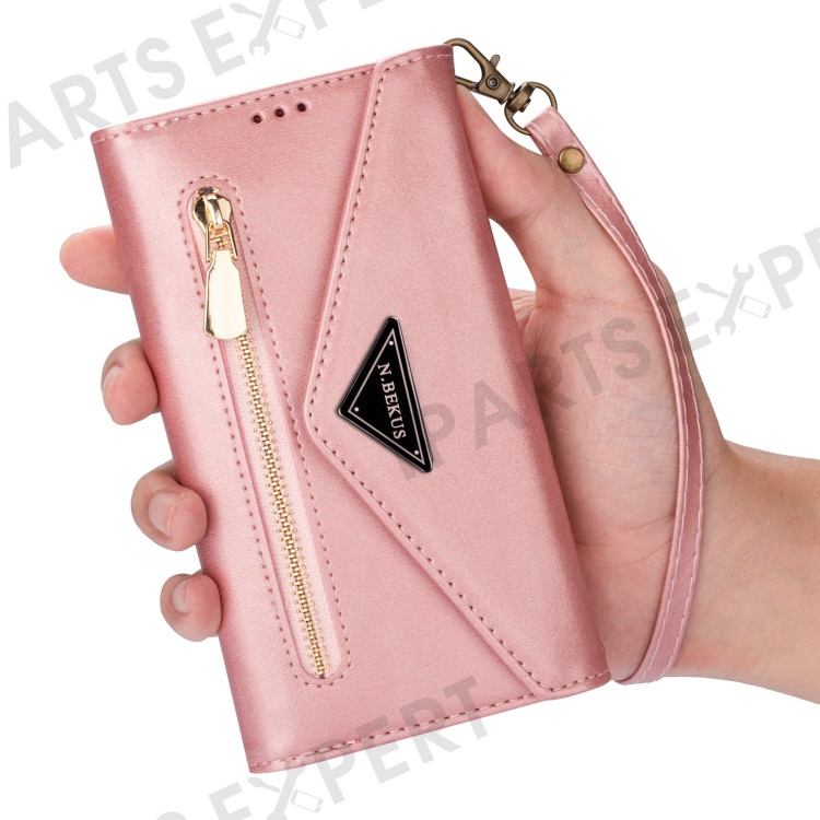 PU Leather Phone Case For Samsung Galaxy A14 5G / A14 4G Zipper Pocket Wallet Stand Cover with Strap - Rose Gold