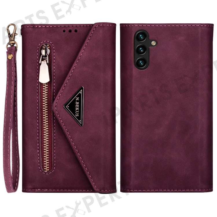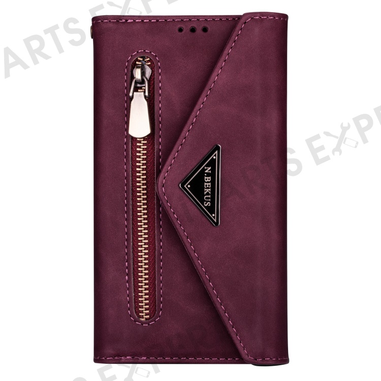 Drop-proof PU Leather Phone Case For Samsung Galaxy A14 5G / A14 4G Zipper Pocket Wallet Stand Cover with Strap - Wine Red