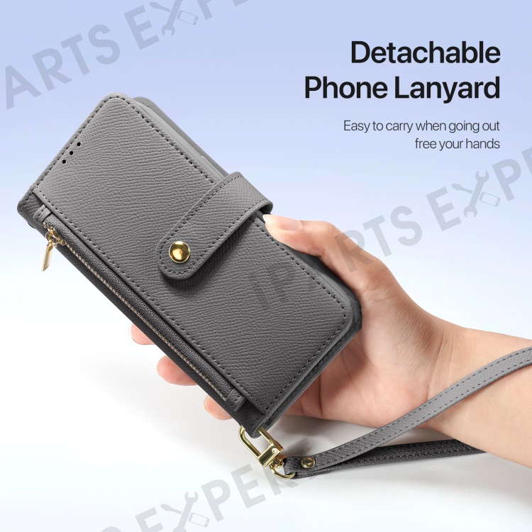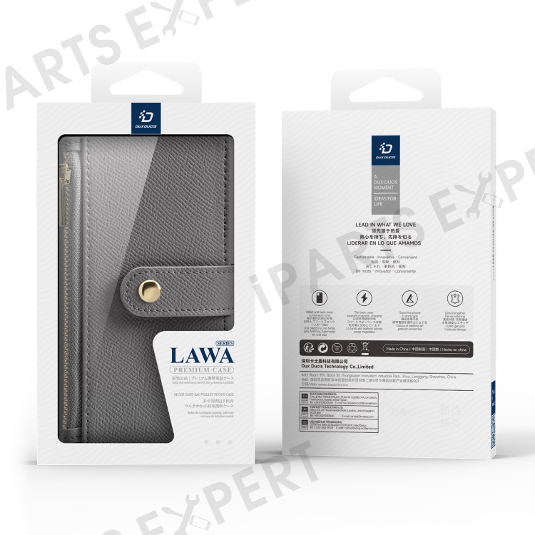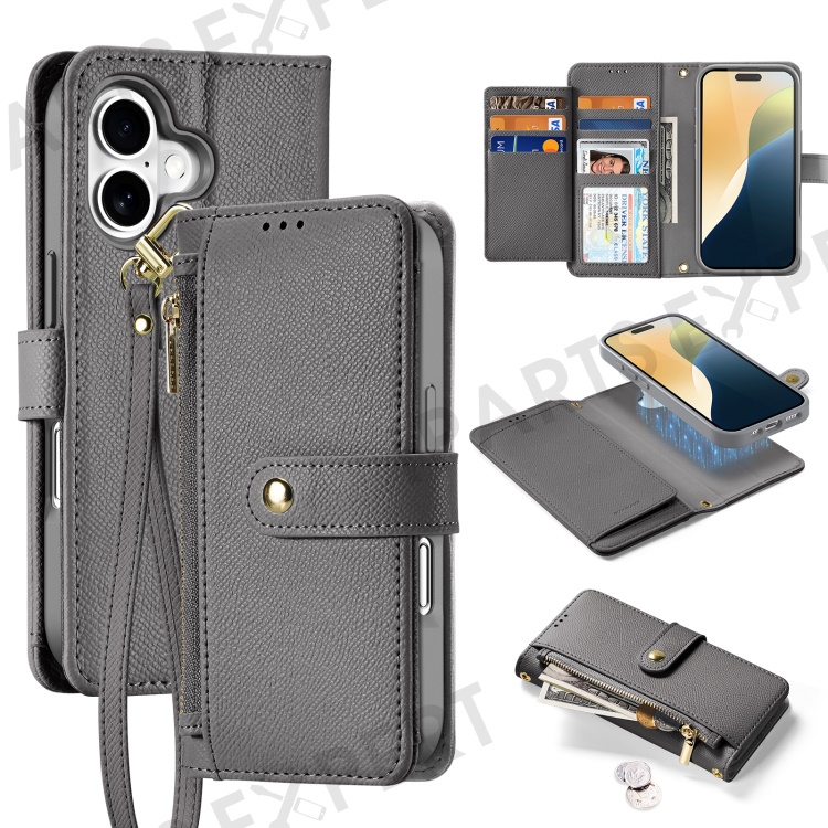 DUX DUCIS Lawa Series for iPhone 16 Magnetic Case Detachable Zipper Wallet Cowhide Leather Cover - Grey