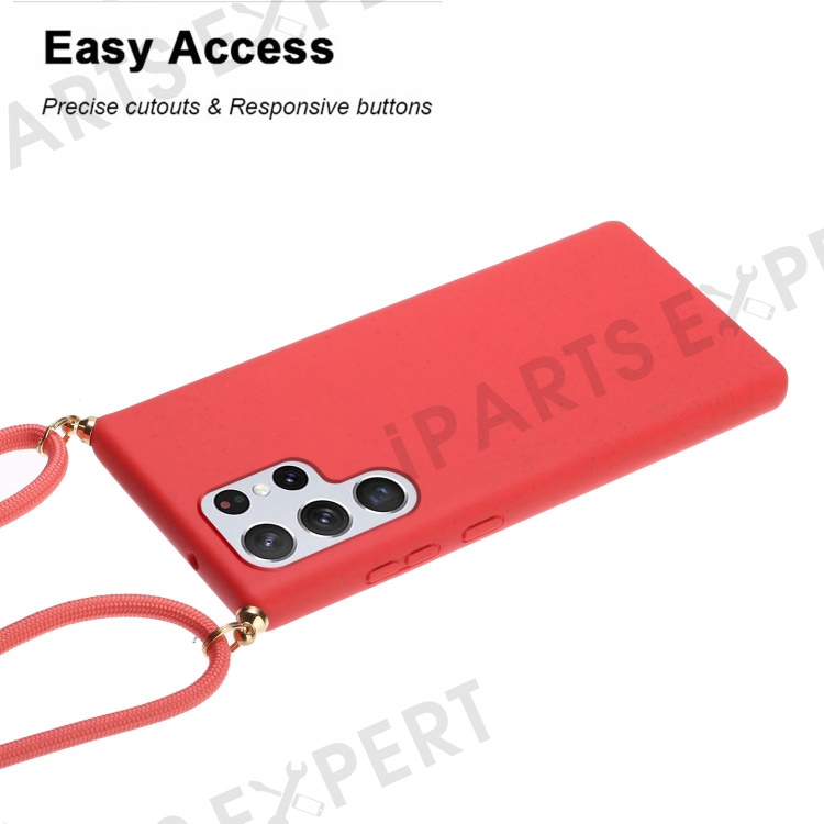 Eco-Friendly Wheat Straw + Flexible TPU Shockproof Drop Protection Case with Adjustable Lanyard for Samsung Galaxy S22 Ultra 5G - Red