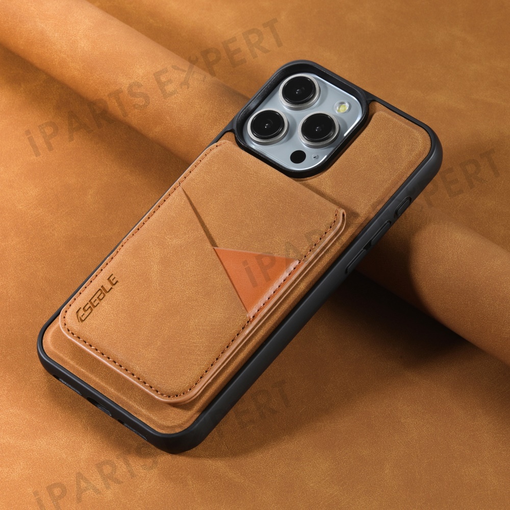 ESEBLE E2 For iPhone 15 Pro Magnetic Case RFID Blocking Retro Leather Back Cover with Detachable Card Holder - Yellow