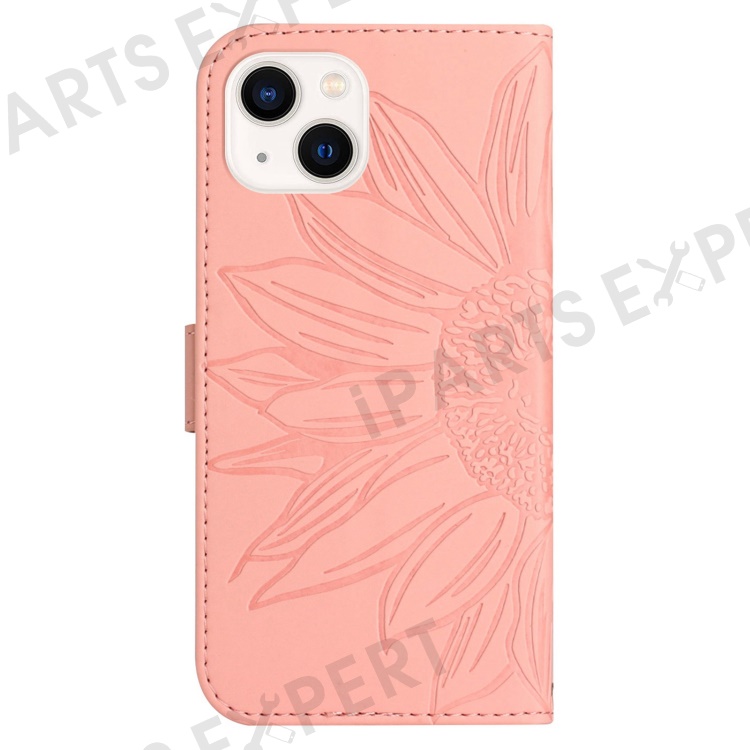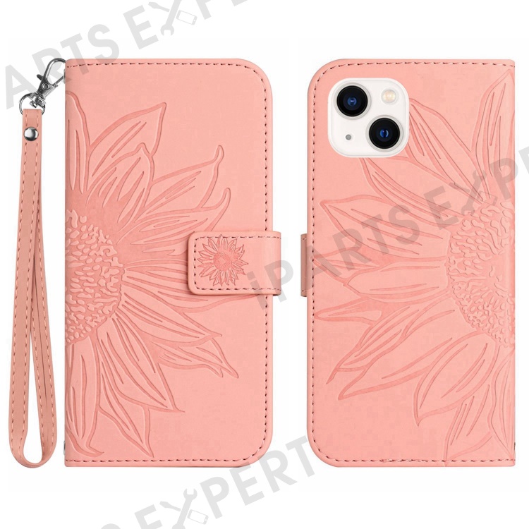 Flip Phone Case for iPhone 14 Plus, HT04 Imprinted Sunflower Viewing Stand PU Leather Skin-Touch Magnetic Wallet Cover with Strap - Light Pink