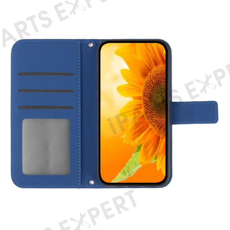 Flip Phone Case for iPhone 14 Plus, HT04 Imprinted Sunflower Viewing Stand PU Leather Skin-Touch Magnetic Wallet Cover with Strap - Sapphire