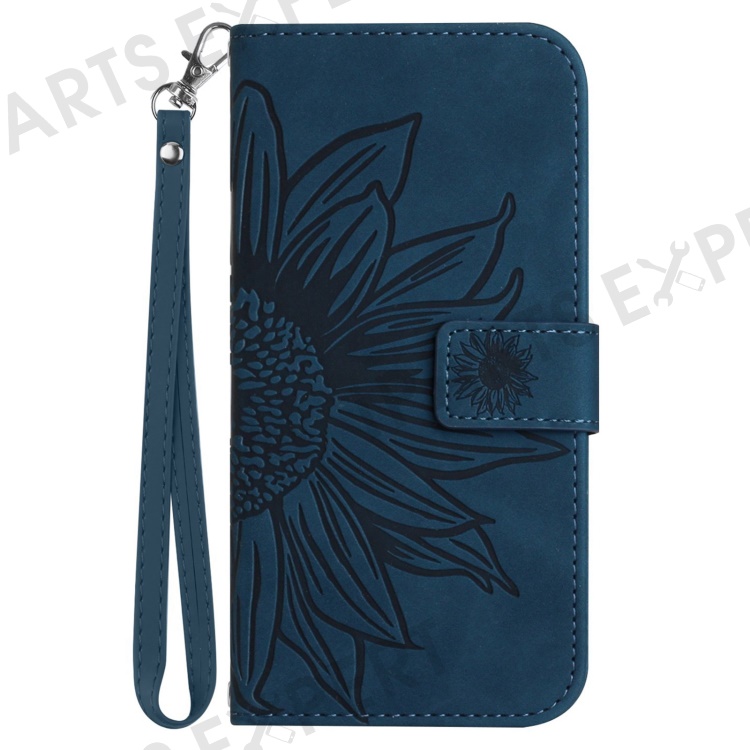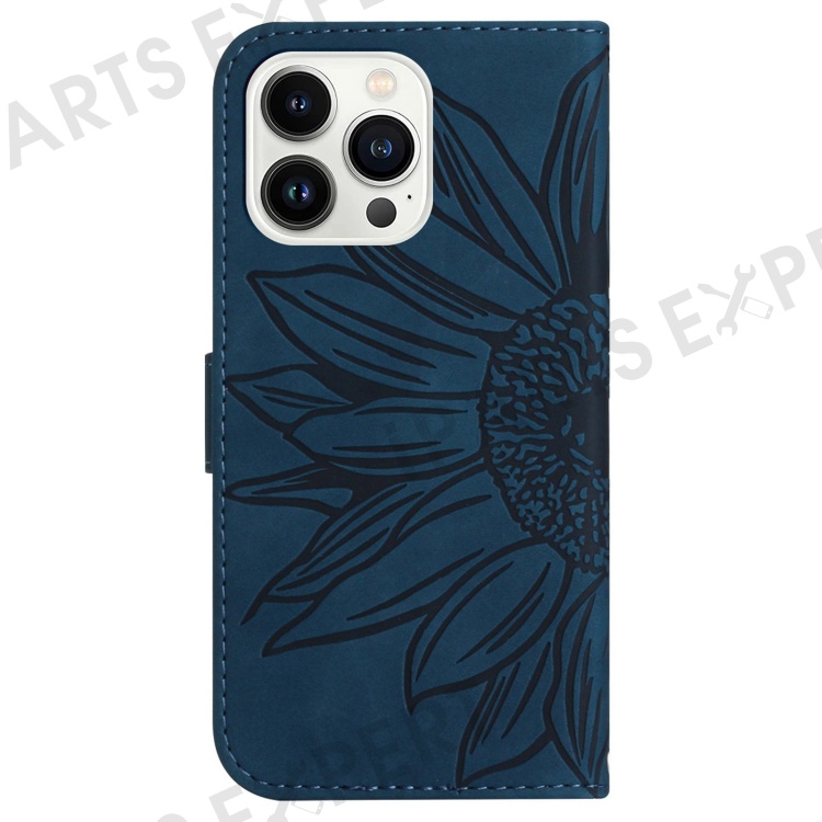 Flip Phone Case for iPhone 14 Pro, HT04 Imprinted Sunflower Hands-free Stand PU Leather Skin-Touch Magnetic Wallet Cover with Strap - Dark Blue