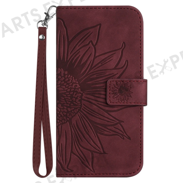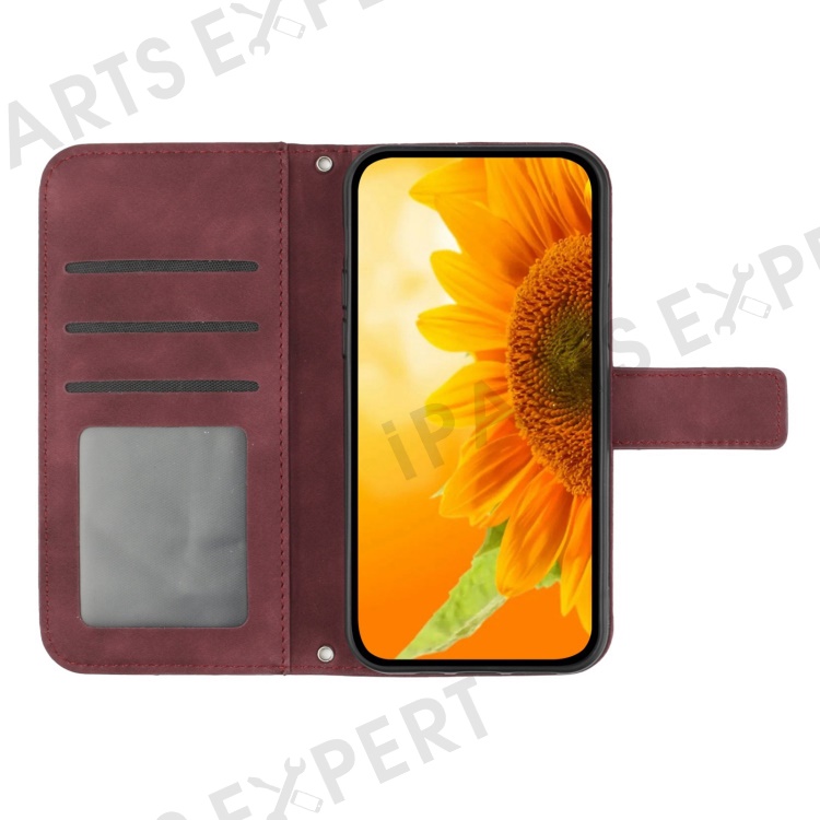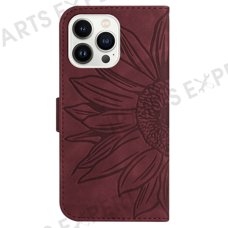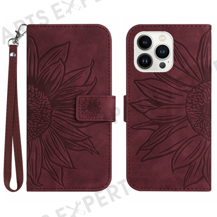 Flip Phone Case for iPhone 14 Pro, HT04 Imprinted Sunflower Hands-free Stand PU Leather Skin-Touch Magnetic Wallet Cover with Strap - Wine Red