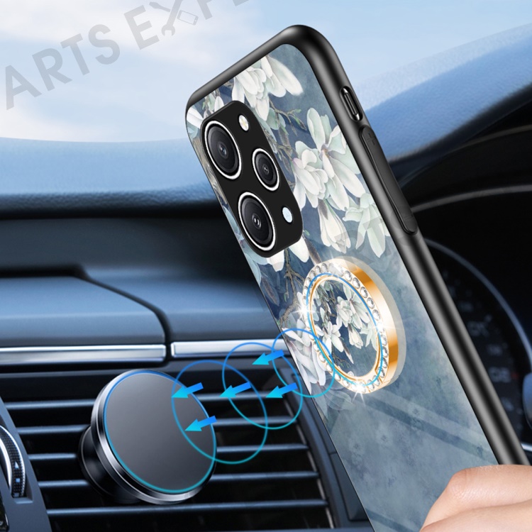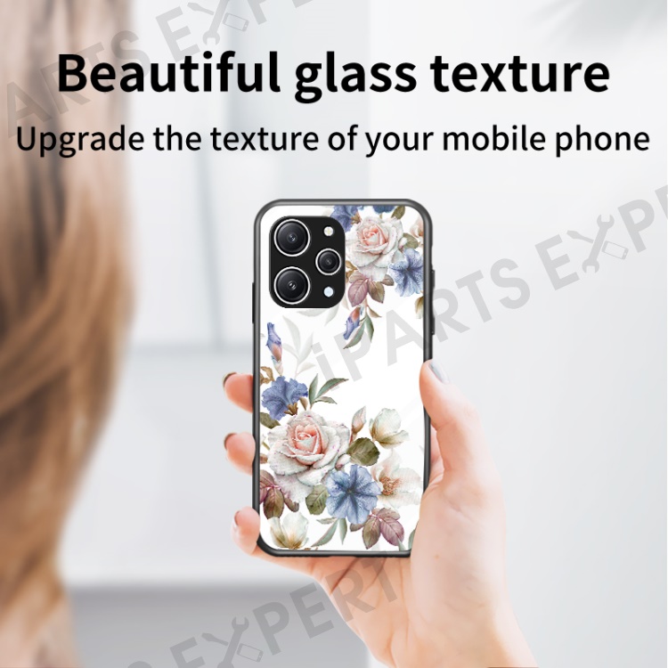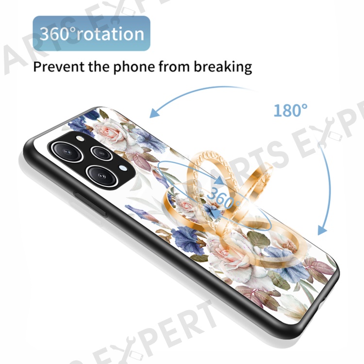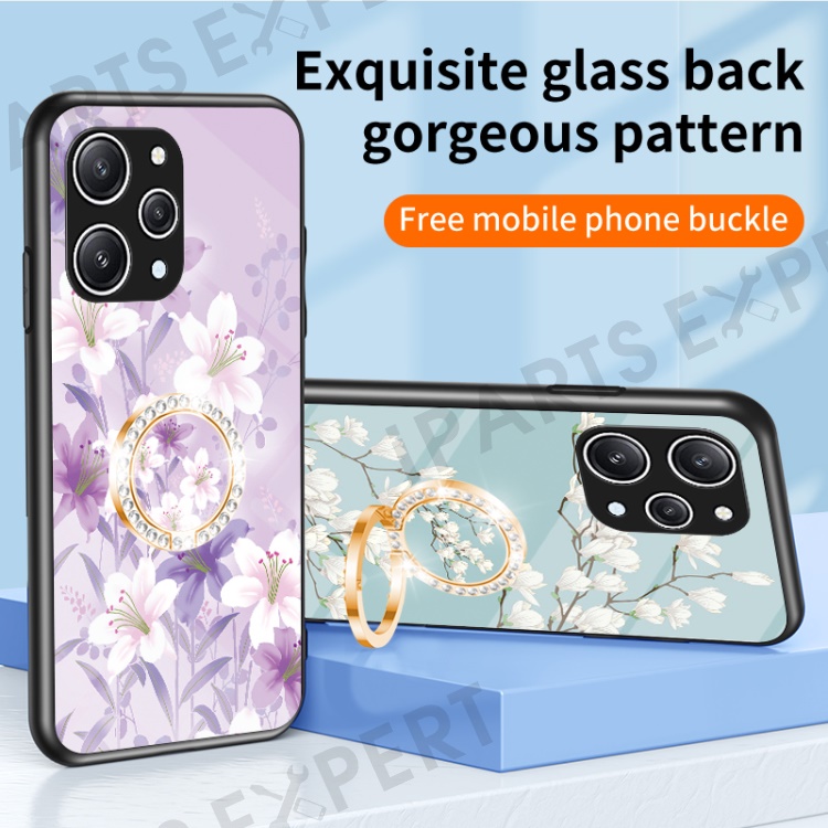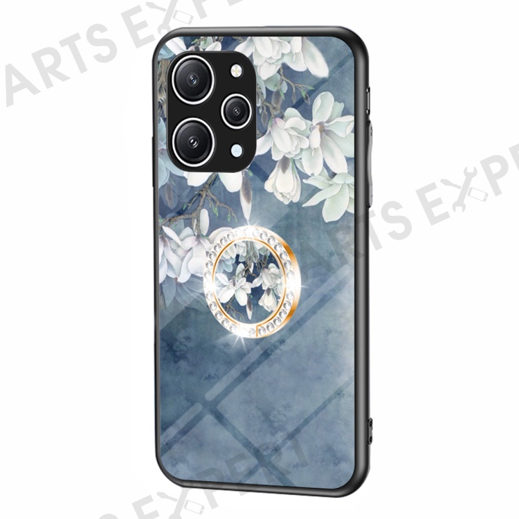 Flower Pattern Ring Kickstand Case for Xiaomi Redmi 12 4G Tempered Glass+PC+TPU Phone Cover - Chinese Rose