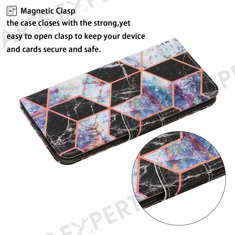 Foldable Stand Wallet Leather Case Pattern Printing Phone Cover Shell with Wrist Strap for Samsung Galaxy S22 5G - Black Marble Pattern