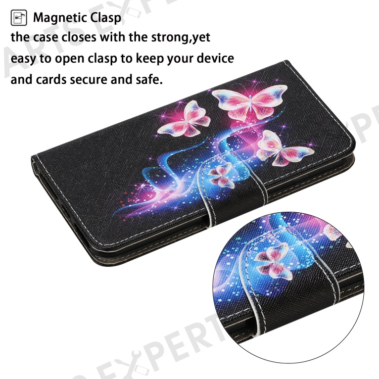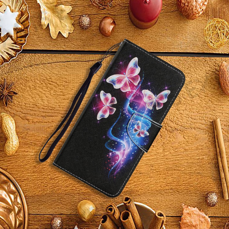 Foldable Stand Wallet Leather Case Pattern Printing Phone Cover Shell with Wrist Strap for Samsung Galaxy S22 5G - Three Fluorescent Butterflies