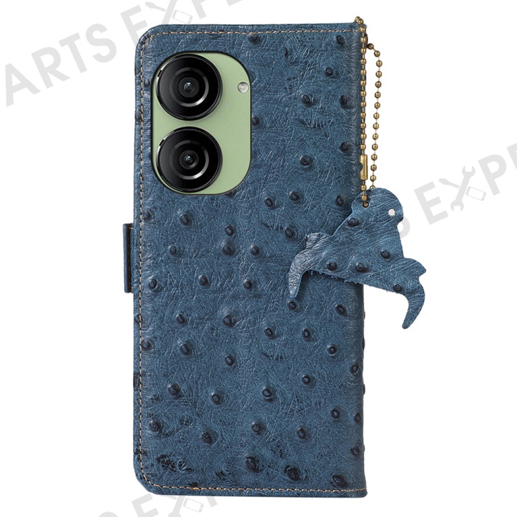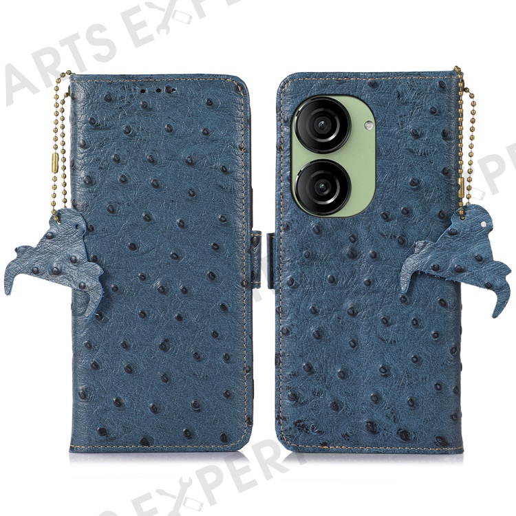 For Asus Zenfone 10 5G / 9 5G Ostrich Texture Genuine Cowhide Leather Phone Cover RFID Blocking Wallet Stand Case - Blue