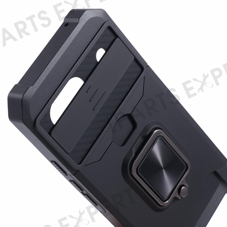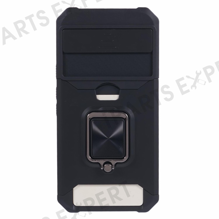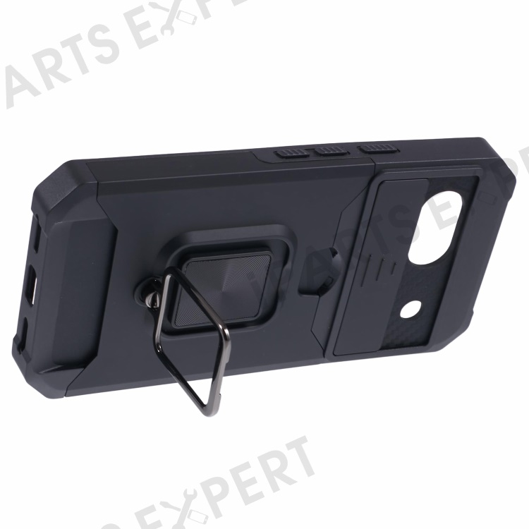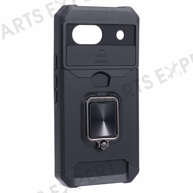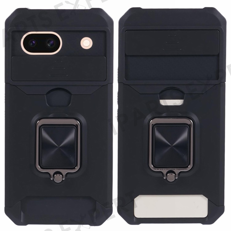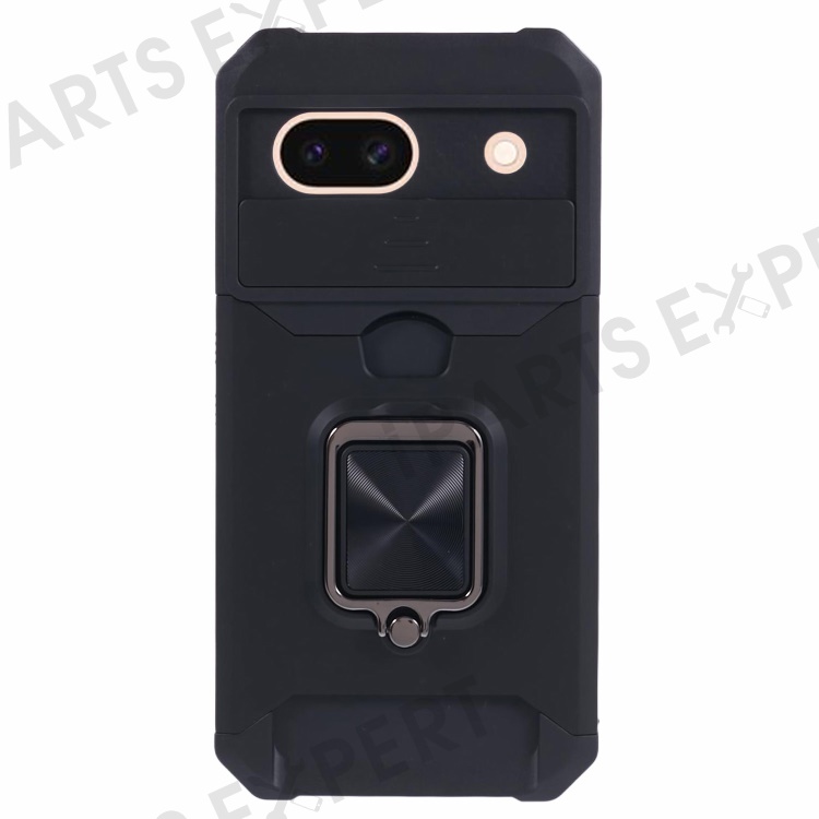 For Google Pixel 8a Cover Camera Slide Lid Card Holder Cell Phone Case with Ring Kickstand - Black