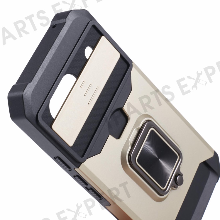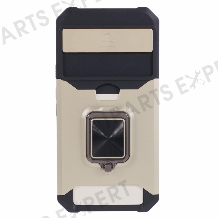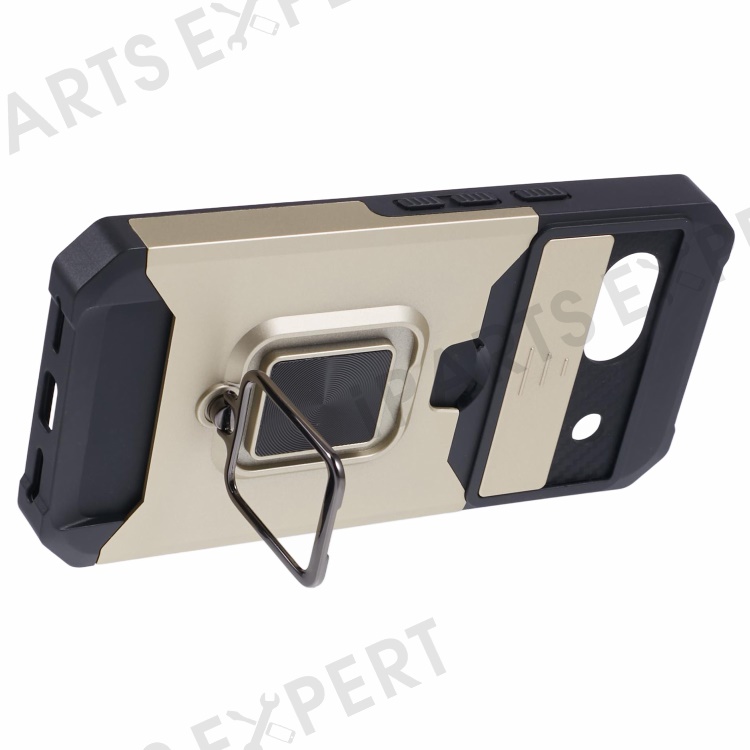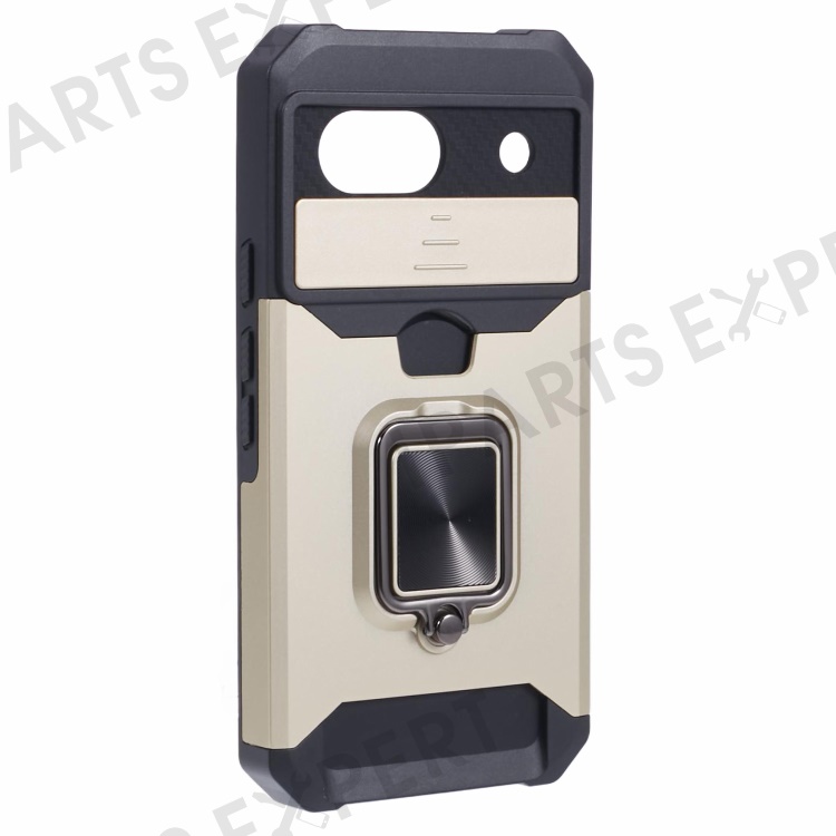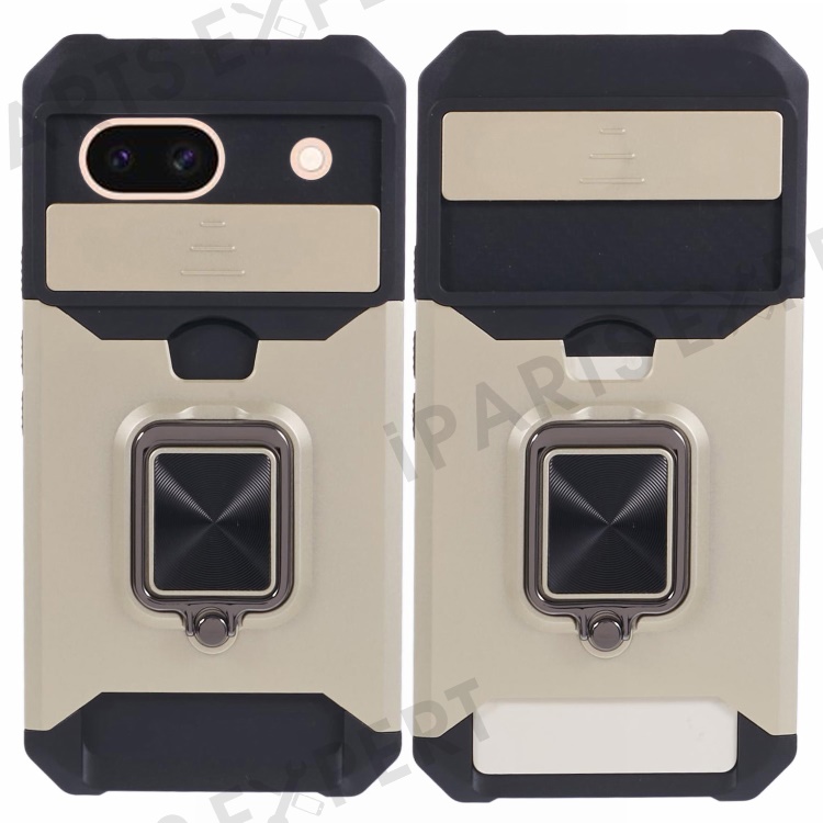 For Google Pixel 8a Cover Camera Slide Lid Card Holder Cell Phone Case with Ring Kickstand - Gold