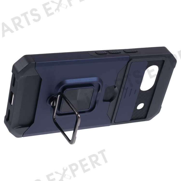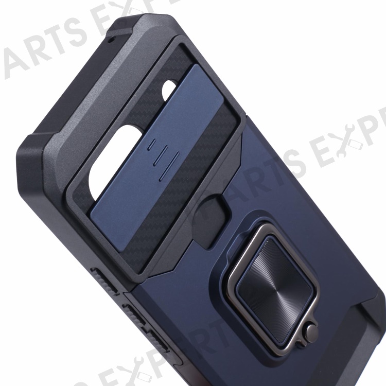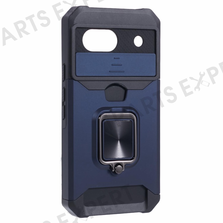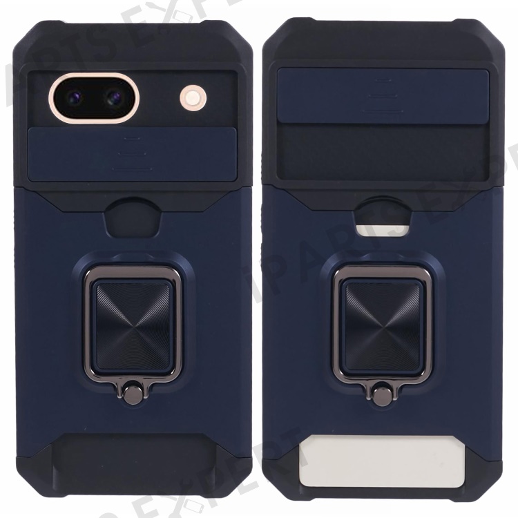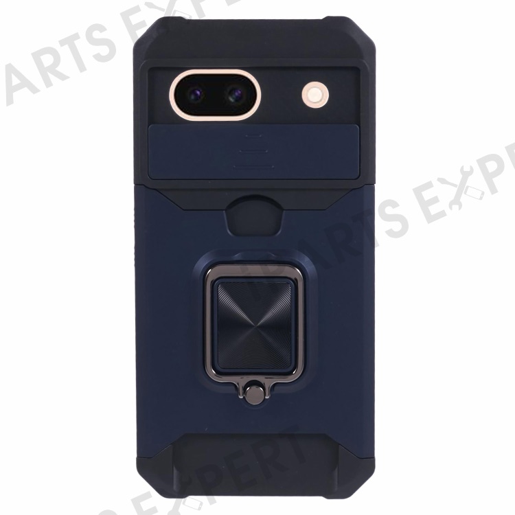 For Google Pixel 8a Cover Camera Slide Lid Card Holder Cell Phone Case with Ring Kickstand - Navy Blue