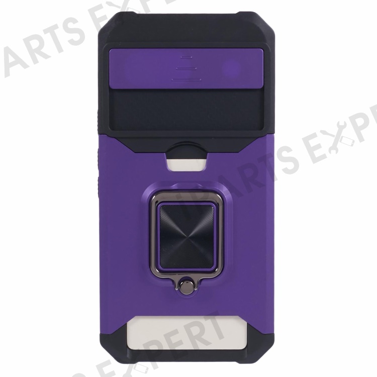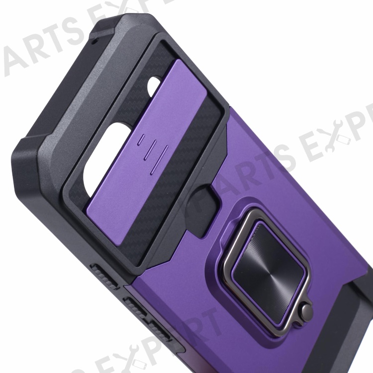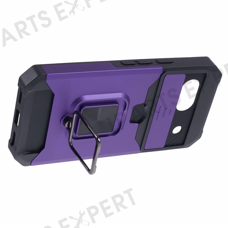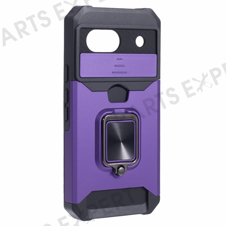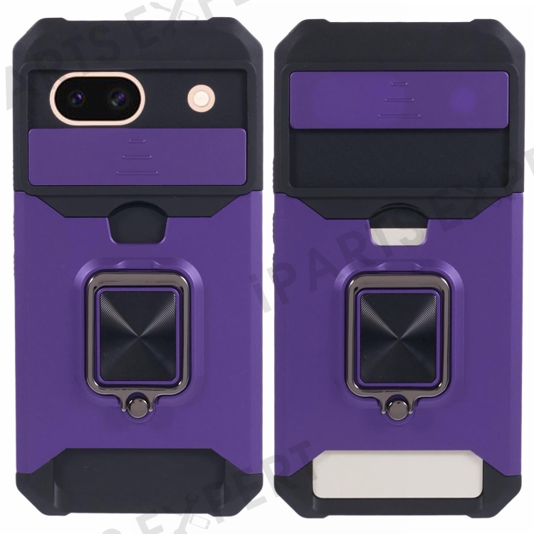 For Google Pixel 8a Cover Camera Slide Lid Card Holder Cell Phone Case with Ring Kickstand - Purple
