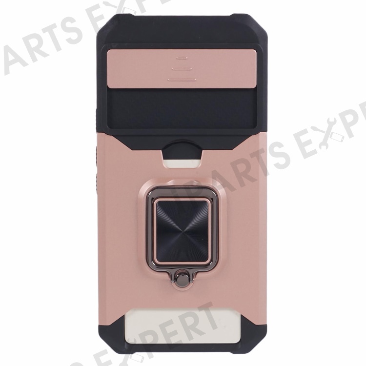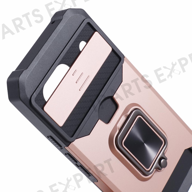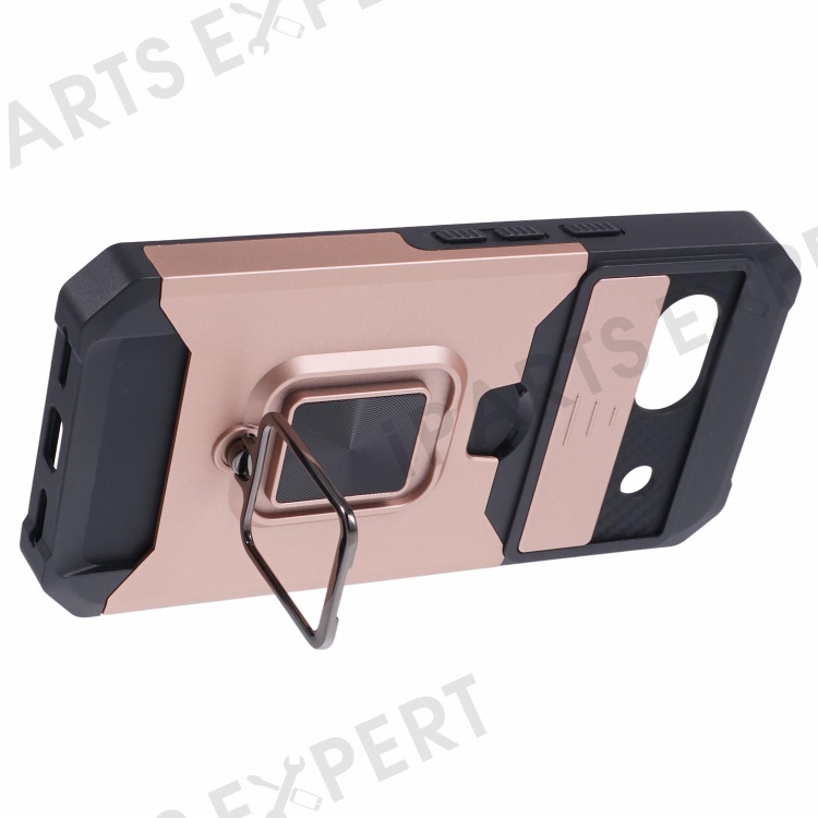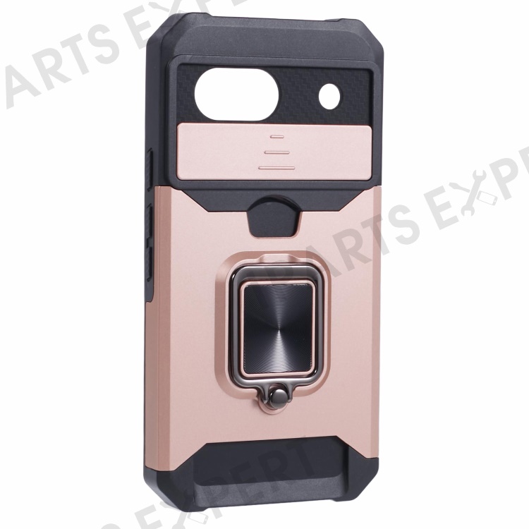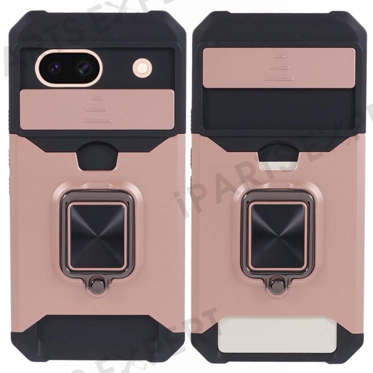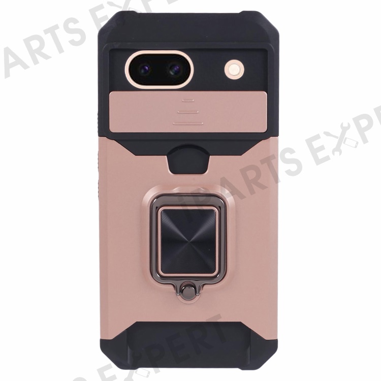 For Google Pixel 8a Cover Camera Slide Lid Card Holder Cell Phone Case with Ring Kickstand - Rose Gold
