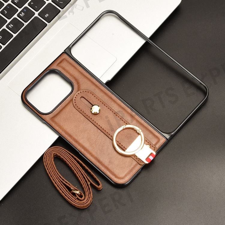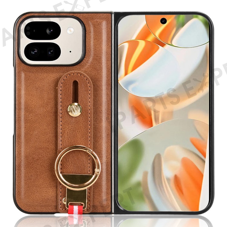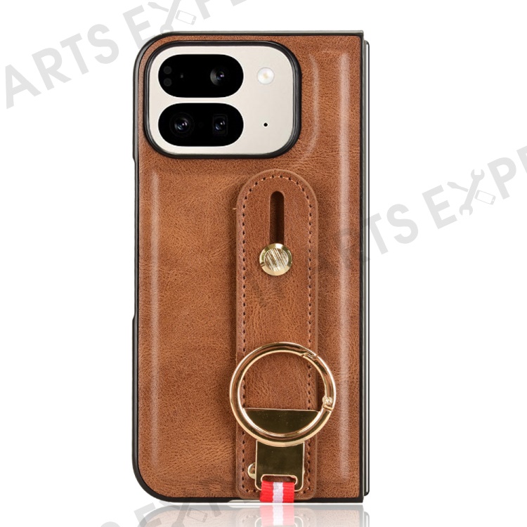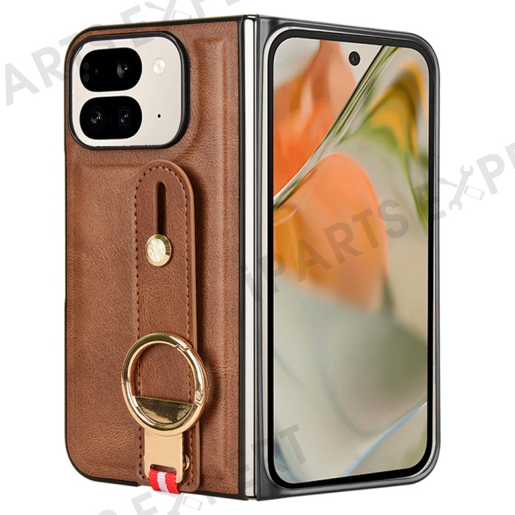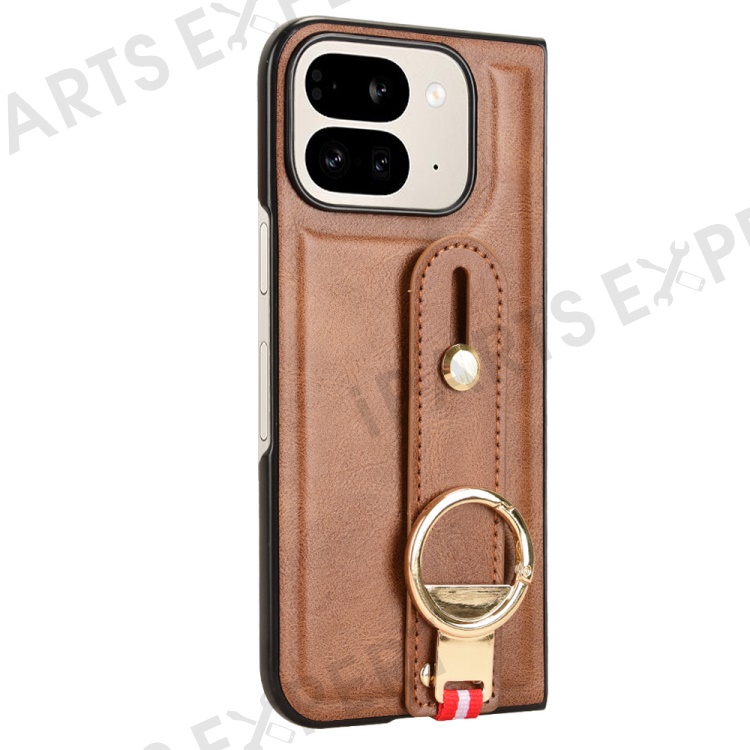 For Google Pixel 9 Pro Fold 5G Case Leather+PC+TPU Wristband Cover with Bottle Opener Ring - Brown