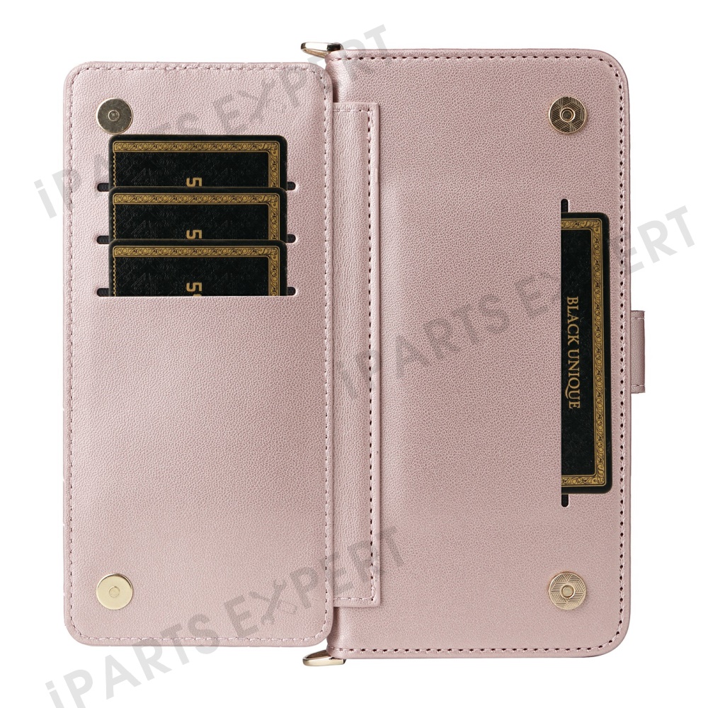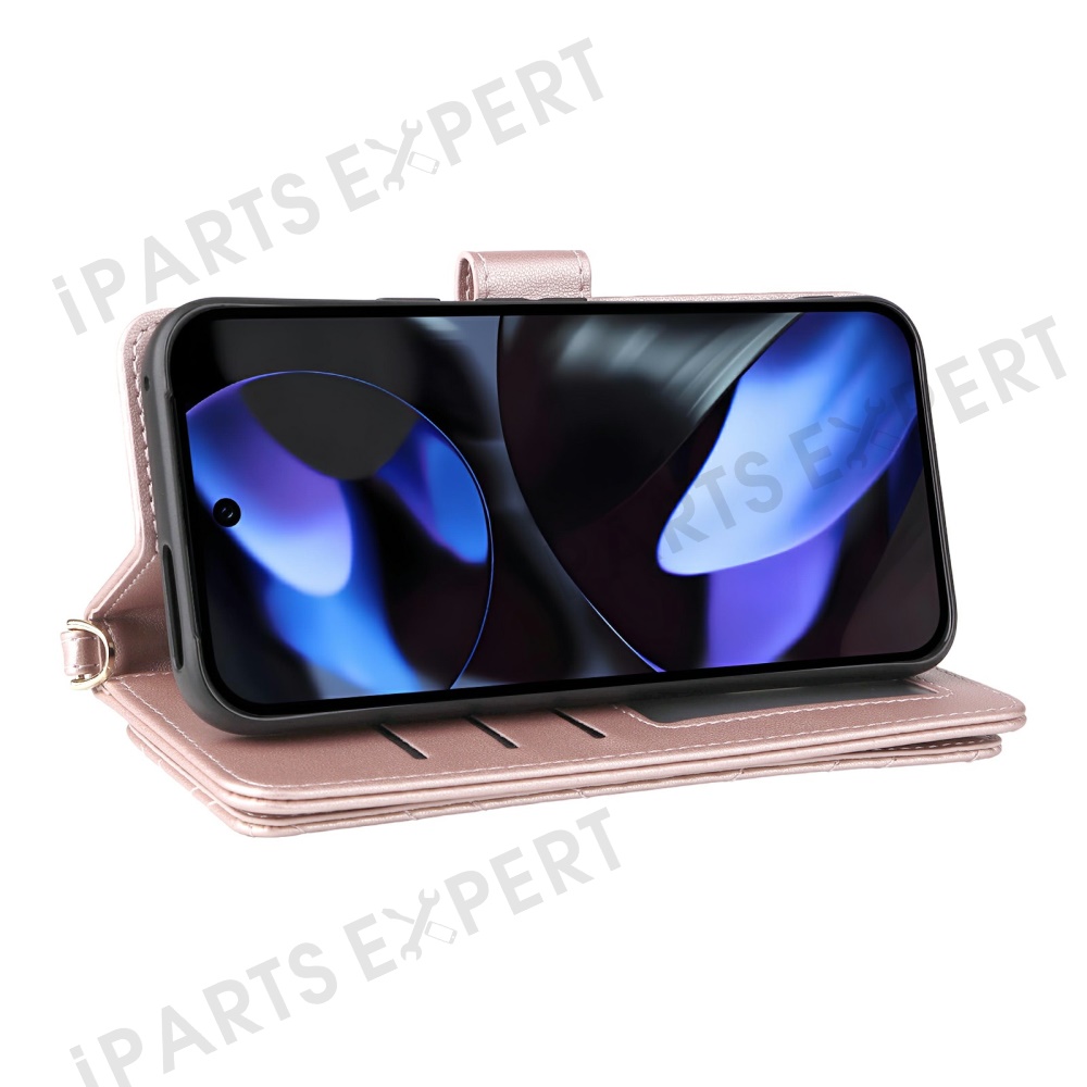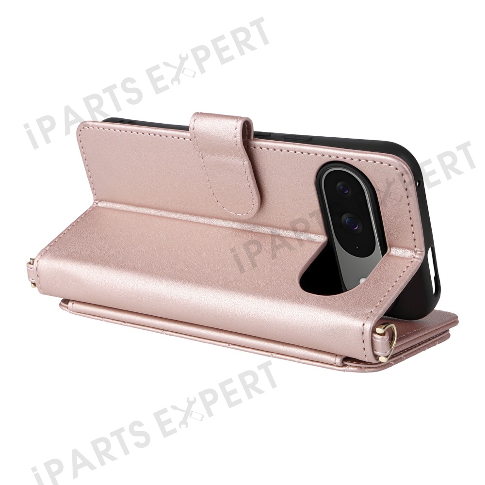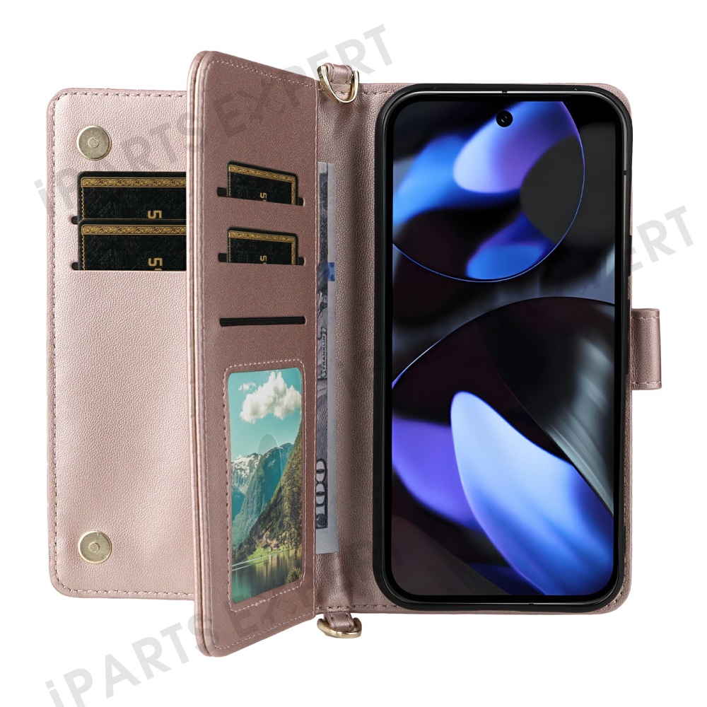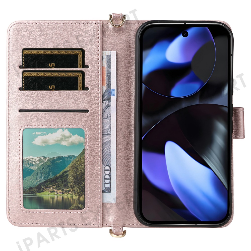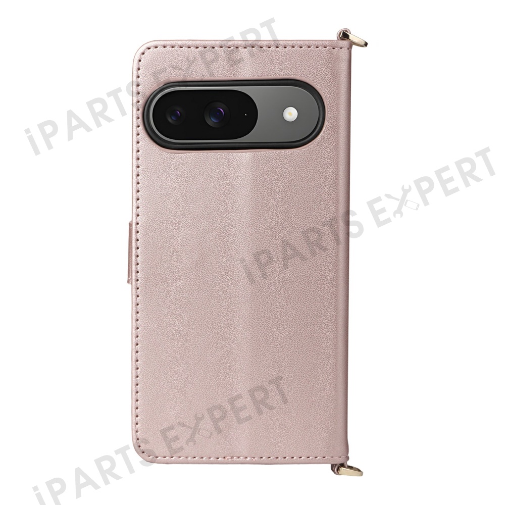 For Google Pixel 9 Pro / Pixel 9 Wallet Case with Shoulder / Wrist Strap Leather Phone Cover Stand - Pink