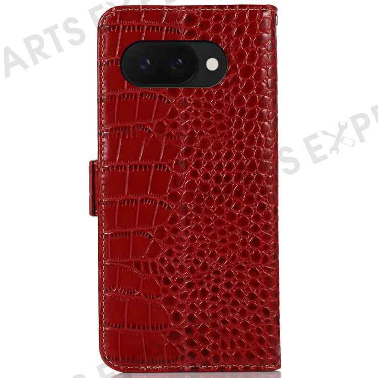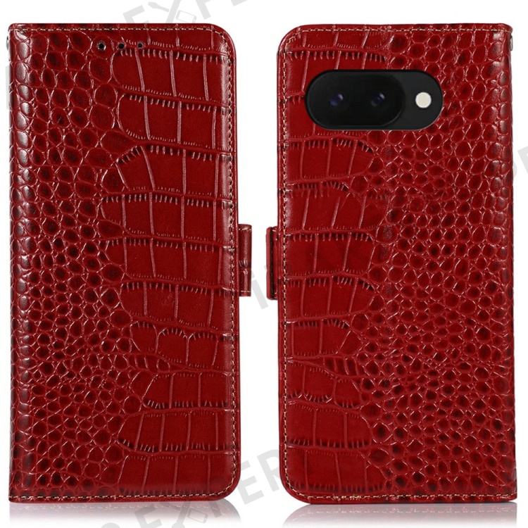For Google Pixel 9a Case Crocodile Texture Genuine Cow Leather Phone Wallet Cover - Red